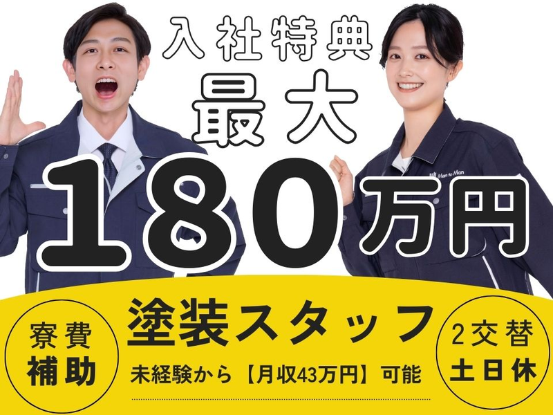 ■仕事内容 \選べる2つの待遇~どちらでも“安定収入”が叶う!/ (1)時給2,100円(月給43万円以上)+入社祝金100万円 (2)時給1,800円+入社特典190万円(入社祝い金100万円、寮費補助90万円相当) 月収43万円以上 or 入社特典190万円 ─スタート時点で経済的な安心感が得られるのが魅力! 「今すぐ収入がほしい」「ゼロからやり直したい」 そんな前向きな気持ちを、しっかり後押しします! 【仕事内容】 <トヨタ自動車九州 宮田工場内> 自動車製造にかかわるお仕事です。 塗装工程で塗料の密着性を良くするための中塗り 実際にクルマのカラーとなる上塗り 光沢を出すためのクリア塗装を行う業務などをお任せします。 多数のパーツが“1台のクルマ”として完成する姿を見届ける やりがいのある工程に携わります。 ※配属は適性に合わせて決定します。 募集職種と異なる配属となる可能性があります (組立・品質管理・ほか各工程の可能性あり) \未経験でも大丈夫!研修サポート充実/ まずは3日間の基礎研修。 その後は1.5~2ヶ月間、メンターが横についてフォローします。 工程は細かく区切られているため、 ひとつずつ覚えていけばOK。 「学校卒業後はフリーター経験しかない…」 そんな方でも問題ありません。 段階的にスキルが身につき、 国産車づくりという大きなプロジェクトの 一員として活躍できます。 \憧れのTOYOTAの車づくりに関われる!/ 未経験から始めて正社員登用も目指せる 「製造は未経験。でもキャリアは積みたい」 「30代前までに正社員を取りたい」 そんな“今の自分を変えたい人”を、 コーディネーターが徹底サポート。 面接練習や試験対策も一緒に行いながら、 正社員登用を目指しましょう。 TOYOTAに関われる誇り+将来の安定が どちらも手に入るチャンスです。 もちろん、短期も大歓迎です! ■仕事の特徴 車通勤OK 髪型・髪色自由 友達と応募OK フルタイム歓迎 長期歓迎 副業・WワークOK シフト制 フリーター歓迎 学歴不問 未経験・初心者OK ブランクOK 経験者・有資格者歓迎 資格不問