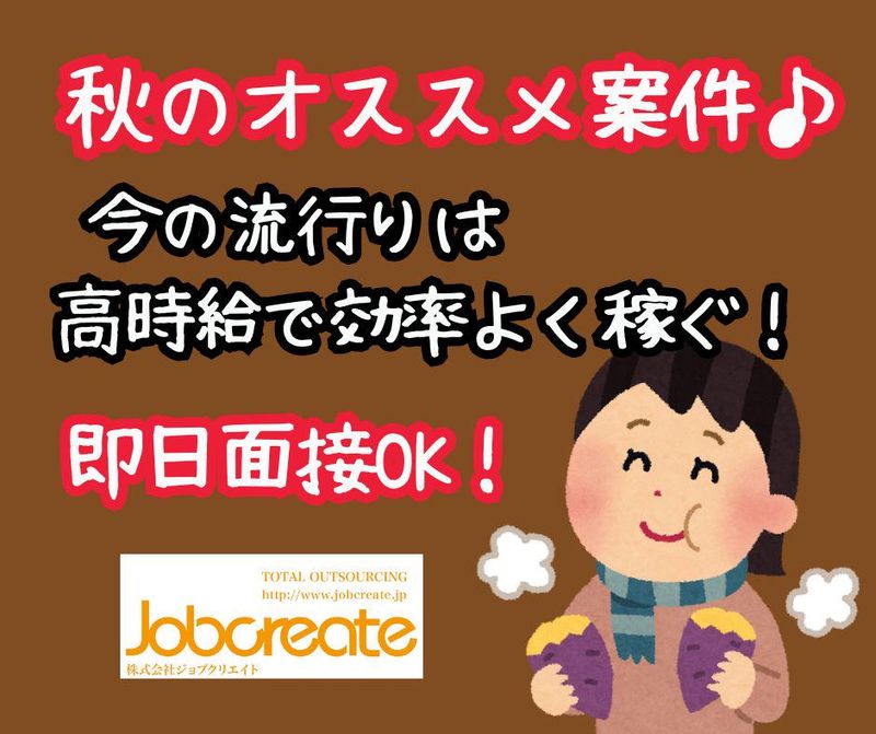仕事内容 No.55021 ===PRポイント=== ◇バイク・自転車通勤OK! ◇職場の担当者が優しい♪ ◇未経験でもすぐに慣れていただけます♪ ◇就業前に現場の見学ができるので安心♪ 高時給1350円 涼しい倉庫で仕分け チルド倉庫内での 食品の仕分け作業となります♪ 未経験でもかんたんに 覚えられるので安心してください☆ 残業なしなので プライベート充実★ WワークもOKです! ▼お仕事の流れ ①担当レーンにカゴ車が流れてきます! ②流れてきた商品のケースにあるバーコードを ハンディーで読み取ります! ③頭上にある各店舗ごとのランプが点灯するので、 その個数分を各店舗のカゴ車へ置いていくだけ! ※ケース単位での仕分けになります! ④仕分けが終わればヒモをひっぱるだけ! ①~④の繰り返しなので スキルはいりません!! ◇職場環境◇ 冷蔵倉庫なので 涼しい環境でのお仕事です♪ 夏はひんやり涼しく、 冬は外の気温のほうが寒いので、 1年中働きやすい環境です^^ 20~60代の幅広い方が就業されており 男性女性活躍中です!! 担当者も優しいので 質問しやすい環境です♪ ◇勤務形態◇ 【休日】シフト制(週4日~) 土日休みOK 相談してください^^ ◇月収例◇ 1,350円×8H×22日=237,600円+交通費全額支給 ◇交通費◇ 全額支給 *公共交通機関の利用以外は 通勤距離により規定支給(車、バイク、自転車、徒歩) ◇アクセス◇ 大阪モノレール「摂津駅」徒歩8分 大阪モノレール「沢良宜駅」徒歩13分 阪急京都線「摂津市駅」徒歩17分 *バイク・自転車OK! 【当社概要】 ジョブクリエイトは 大阪府高槻市にある派遣会社です。 製造、倉庫内、梱包などの軽作業はもちろん オフィスワークや販売促進など 豊富な人材サポートを行っております! 阪急高槻市駅から歩いて3分♪ 来社不要のWEB面談も実施しております! ご希望の方はお気軽にお申し付けください☆ ※土日祝日に頂いたご応募に関しましては、 翌営業日に順次対応させていただきます。