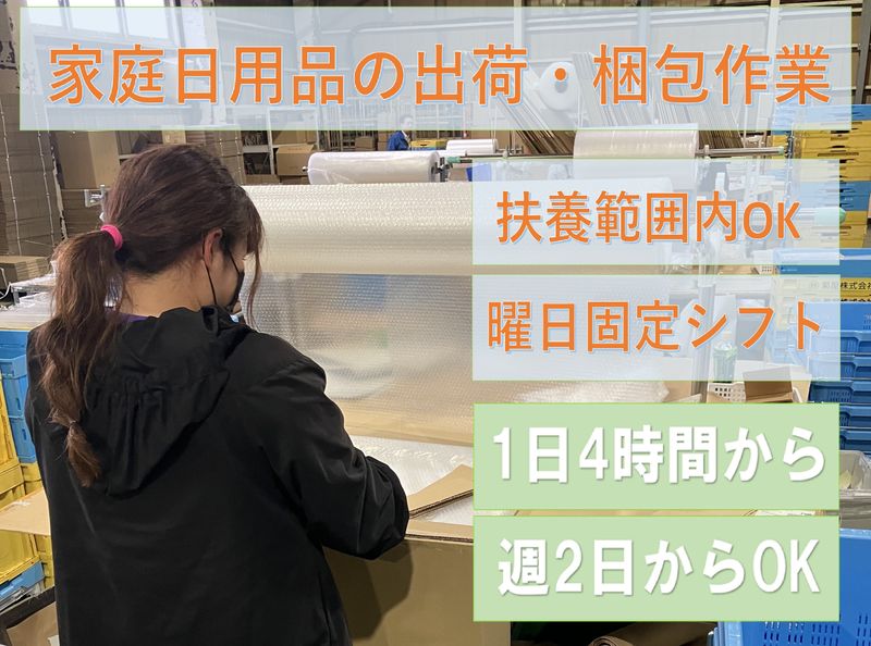 仕事内容 倉庫内で梱包・荷札貼りの作業などを行う アルバイト・パートの軽作業スタッフを募集しております。 <おすすめポイント> ・1日4h~勤務OK ・週2日~勤務OK(勤務する曜日は固定) ・服装自由 ・未経験OK(現在のアルバイト・パートさんはほぼ未経験) <募集職種> アルバイト・パート/軽作業スタッフ <仕事内容> ・収集された商品を発送できるように梱包し荷札を貼る作業になります。 商品が分からなくても先輩社員・パートさんが随時教えながら作業出来ます。 不明な点はすぐ確認が出来るので安心して作業を行えます。 初めてのパート・アルバイトの方はもちろん 梱包やピッキング、荷札貼りなどの倉庫内作業の 経験がない方でも大丈夫です。 安心して業務が行えるように研修をしっかり行います。 ※作業の進捗によって下記付随の作業が発生する場合があります。 ・ピッキング作業(簡易的なハンディ操作でスキャンして商品を集めます) ・商品の格納作業(商品ごとに決められた位置へ置く作業です) <職場環境について> 現在、20代・30代・40代・50代の方が 男性女性問わず在籍しており、 主婦(夫)の方や中高年・ミドルの方を 中心に活躍している職場です。 家庭やお子さんの都合などでシフトの変更なども しやすいので、お互い助け合って働ける環境です。