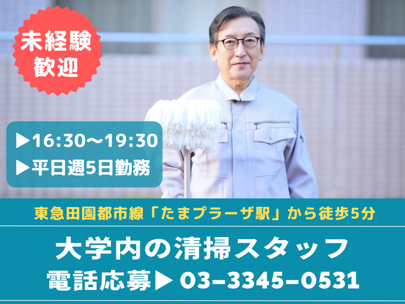 仕事内容 *.·┈┈┈┈┈*.·┈┈┈┈┈*.·┈┈┈┈┈*.· ✨夕方の3時間勤務で無理なく働ける✨ ✨土日はお休みでプライベートも充実✨ ✨簡単シンプル作業で未経験でも大丈夫✨ *.·┈┈┈┈┈*.·┈┈┈┈┈*.·┈┈┈┈┈*.· 当社は 12/27(土)~1/4(日)の間、 年末年始のお休みをいただいております。 休業期間中にいただいたご連絡については 1/5(月)より順次対応いたします。 *.·┈┈┈┈┈*.·┈┈┈┈┈*.·┈┈┈┈┈*. 〖お仕事内容〗 ⏩教室清掃 └黒板・机の拭き掃除 └床の掃き掃除・掃除機がけ ⏩ゴミ回収 など! ✅先輩スタッフがしっかり フォローするので未経験の方や、 ブランクがある方もご安心ください◎ ✅シンプルな清掃業務なので、 難しいことはありません! 少しずつ慣れていけばOK! ✅サポート体制は抜群♪ わからないことは 何でも質問してください! ⟡.· ┈⟡.· ┈⟡.· ┈⟡.· ┈⟡.· ┈⟡.· ┈⟡.· ┈⟡ ※神奈川県・東京都の中で 転勤の可能性があります。