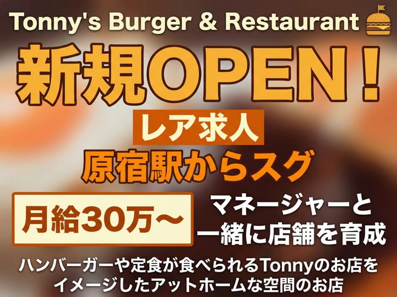 仕事内容 ━━━━━━━━━━━━━━━━━━━━ ⭐ 求人のポイント ━━━━━━━━━━━━━━━━━━━━ ✅ 2026年3月オープン♪ ✅決まった型にとらわれず、スタッフの声 や工夫をお店づくりに反映できる ✅ 月給30万円スタート! 店長・副店長手当も充実! ✅ 「明治神宮前駅」徒歩8分の好立地! ✅ 週休2日制(月8日休み) ━━━━━━━━━━━━━━━━━━━━ ⭐ Tonny's Burger & Restaurant について ━━━━━━━━━━━━━━━━━━━━ <コンセプト> ”日本が好きなアメリカ人Tonnyが飲食店を 開いたら” ”ぎゅうぎゅう””わいわい” シンプルだけど美味しい、愛情のこもった ハンバーガーや定食が食べられる Tonnyのお店をイメージした アットホームな空間のお店♪ 今回は、この新店の運営を担う 【店長・店長候補】を募集します。 ━━━━━━━━━━━━━━━━━━━━ ⭐ お店を「育てる」やりがい ━━━━━━━━━━━━━━━━━━━━ この仕事は、単に店舗を回すだけではなく、 店長に大きな裁量を持たせています。 「売上」という数字だけを追うのではなく 一人ひとりの“人”と向き合いながら、 お店のファンを増やしていく。 そんな“お店をマネージャーと 一緒に育てていく”やりがいと喜びを、 ぜひここで実感してください。 ━━━━━━━━━━━━━━━━━━━━ ⭐ 業務内容 ━━━━━━━━━━━━━━━━━━━━ 店舗運営業務全般をお任せします。 【具体的な業務内容】 ✅ 接客、オーダー対応、レジ対応 ✅ 調理業務 ✅ スタッフのシフト管理、育成 ✅ 売上、在庫管理、発注業務 オープンの立ち上げから 関わることで、オペレーションの構築など ゼロからお店を作る経験を 積むことができます。