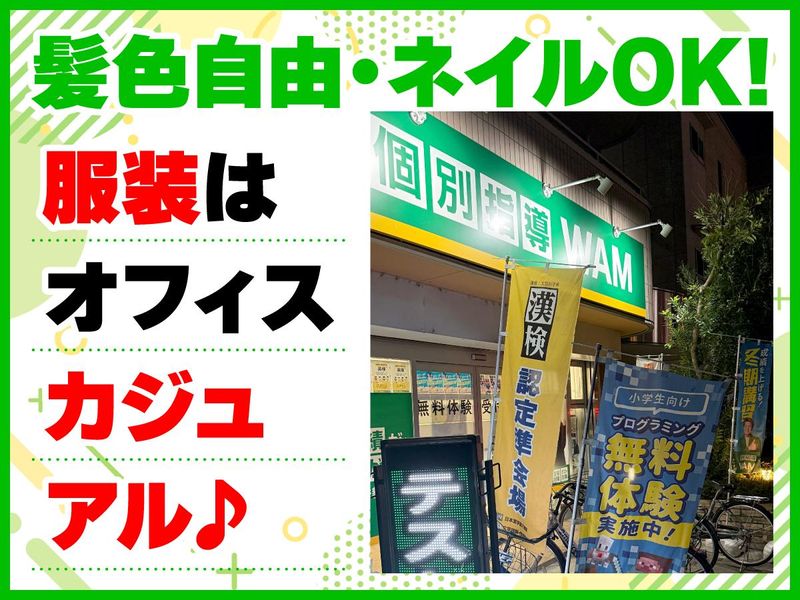 職場環境 従業員数:20名 大学生から50代・60代までの幅広い年齢層が在籍しています。 学生15名(早稲田、慶應、明治、文教大学など) 主婦2名 社会人3名 学生さんは教育関連に関心のある方が多く、 塾講師の経験が就活で役立った!との声も◎ 禁煙