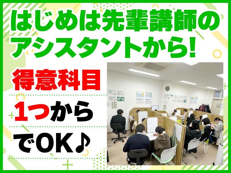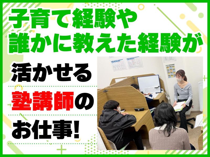仕事内容 ☆■■■■■■■■☆■■■■■■■■☆ 子育て経験や誰かに教えた経験が 活かせる塾講師のお仕事! 高時給1400円スタート! ブランク有もOK! 週1~で家庭や学業との両立も可能♪ ☆■■■■■■■■☆■■■■■■■■☆ 個別指導塾での小学生・中学生への指導を お任せします。 *中学生メイン/1コマ90分。 *基本、講師1名に対し生徒2名で行います。 はじめは先輩講師のアシスタントから! *希望をすれば事務作業(給与発生)もあり。 *英語や数学(算数)が得意な方は特に歓迎! もちろん、国語・理科・社会が得意な方も 活躍できます◎ 塾講師や教育関係の経験者はもちろん、 未経験やブランクがある方も大歓迎です! 子育て経験や誰かに教えた経験もそのまま 活かせます。 ◆丁寧な研修制度ありで安心◎ <研修スケジュール> 座学(1~2時間)からスタート →先輩講師のアシスタント →休みの講師の振替授業 →1対1授業 →1対2授業 あなたのやりやすい教え方を尊重しながら、 一人前になるまで親身に寄り添います。 ◆高時給1400円~スタート&昇給あり! 短時間でサクッと働きたい方にもピッタリ☆ 経験者の方は実績や能力に応じて スタート時給をしっかり考慮します。 ◆事務業務をすればさらに収入UP! 授業の合間にPC事務をお手伝い いただければ、別途事務給を支給! スキマ時間をそのまま収入に変えられます。 しっかり稼ぎたい方にオススメです! ◆シフトは柔軟に対応します◎ 週1回~、短時間から気軽に相談OK! 子育てが一段落した方も職場復帰が可能♪ 家事と両立したい方や、子育て中の方も 無理なく続けられる環境です。 【こんな職場です】 講師と事務スタッフがこまめに 声を掛け合い、気づいたことは 相談し合っています。 困った時にすぐ相談できる環境なので、 一人で抱え込む心配はありません◎ 生徒さんの成長を間近で感じられるのが この仕事の醍醐味! 「できた!」の瞬間を一緒に喜べる、 やりがい満点の環境です。 <社会人スタッフの声> 会社員時代はバリバリと仕事をしていたので リタイア後も何か新しいことに挑戦したいと 思ったのが始めたきっかけです。 色んな学力・性格の子どもたちに教えるので 上司や部下とコミュニケーションを大事に しながら仕事をしていた時の経験を 活かして日々接しています。 「テストの点数が上がった」 「応用問題が解けるようになった」 「英語への苦手意識が少なくなってきた」 自分の試行錯誤の結果が子たちの成長に つながっていると間近で感じられることが この仕事の面白いところです! ー元会社役員の男性講師 得意なことを活かして、地域の子どもたちの 学びを楽しく支える仕事にチャレンジしませんか?