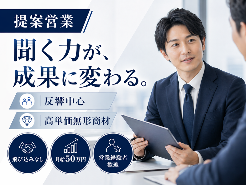 求めている人材 [必須] ・何らかの営業経験をお持ちの方(業界・商材・年数不問) ・相手の話を整理しながら提案内容を組み立てられる方 ・自身の成果や収入向上にコミットできる方 [歓迎] ・無形商材や課題解決型の営業経験をお持ちの方 ・論理的に物事を整理し、説明するのが得意な方 ■ 私たちの約束 年功序列、社歴によるハンデは一切ありません。 入社1年目から圧倒的な成果を出し、高収入を手にする20代・30代が多数活躍しています。 「自分の実力だけで稼ぎ切りたい」という本気の方の挑戦を歓迎します。
