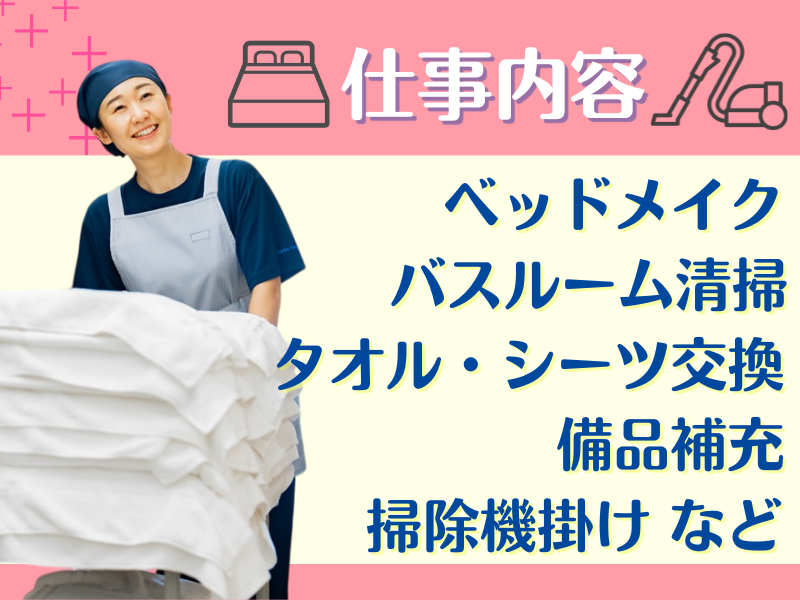 職場環境 \未経験ブランクOK/ 幅広い年齢層の方活躍中! \接客なし!/ チェックアウト後の客室清掃のため、 お客様の対応はなし! 作業は基本1人! 人と話すのが苦手な方や、 黙々と働きたい方にもぴったりです◎ 喫煙所:喫煙所あり(屋外)