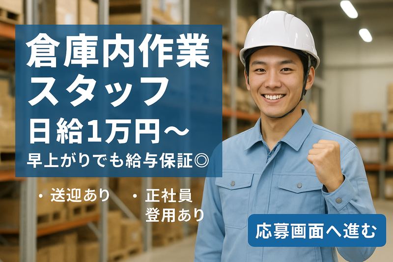 仕事内容 ✨ 月収25万円以上も可能! ┗早上がりでも8時間分の給与保証◎ ✨ 残業ほぼなし!プライベートも充実! ✨日払い・週払い相談可能 ✨ 無料駐車場完備&送迎ありで通勤楽々! ✨ 平日メイン勤務(週4~5日程度) ✨ 正社員登用あり! ✨ 希望者は保険加入も可能! ✨20代30代のスタッフが9割以上 ✨最年長は50歳のスタッフが活躍してくれています! ✨若手、ミドルスタッフが多く活躍してくれている職場です! …………………………………………… 難しい作業や特別なスキルは 一切ありません。 \20代フリーター・第二新卒も活躍中!/ 未経験からスタートした先輩ばかりなので 安心してご応募ください! ✦・━・✦・━・✦・━・✦・━・✦・━・✦・━・✦ 【11月限定】入社祝い金あり ✦・━・✦・━・✦・━・✦・━・✦・━・✦・━・✦ 【具体的なお仕事内容】 物流倉庫での軽作業です。 一人で黙々としての作業ではなく 7、8人のチーム体制での仕事になります。 ・商品の仕分け ・検品/チェック ・倉庫内やコンテナ内の簡単な清掃 ※重い物はチームで協力して対応します。 ◎空調の効いた快適な倉庫での勤務 ◎作業はチームで行うため、 協力しながら進められます 未経験スタート大歓迎! わかりやすいマニュアル &丁寧な研修があるから安心◎ ―――――――.。o*o。.―――――――― 社員一人ひとりのキャリアアップや 将来の夢を応援する社風を 大切にしています。 現場作業からスタートして、営業職へ キャリアチェンジした社員も在籍。 入社1年目で月収75万円を4ヶ月連続で 達成している営業スタッフもいます。 「やりたいことがある」 「将来は独立したい」 という方も大歓迎。 代表は現役の投資家✨ 飲食店開業など社員の 夢を資金面でもサポートしています。 自由な社風の中で、あなたの可能性を 広げてみませんか?