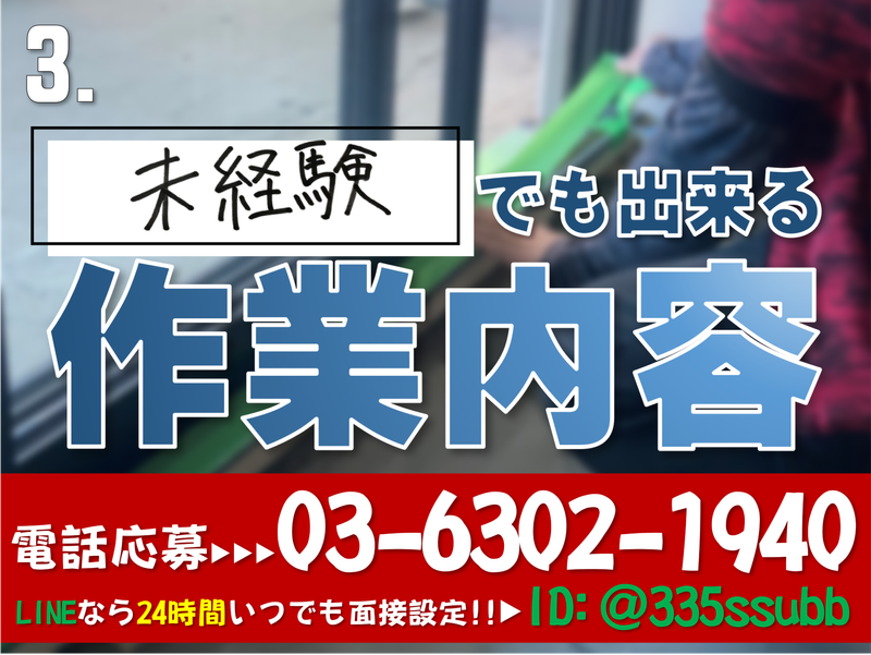 仕事内容 《建築現場の清掃・片付け等の現場軽作業スタッフ》 日払いOKで、スグ給与!ほぼ毎日が給料日も可能! ・LINEなら24時間いつでも面接予約OK! <仕事内容> 多能工の仕事とは、現場の清掃片付け・養生・資材移動・職人さんの手元作業と 多種多様なニーズに答える仕事です。 ・軽作業が多いので、極端な肉体労働ではありません。 仕事で体を酷使したくない方もOK! ・難しい道具や技術が必要な仕事ではないので、 稼働2~3日で慣れてくるスタッフも多いですよ! ・未経験者には、1日通して本社で実技研修行います。 ・道具の使い方や、現場アルアルなどしっかり教えるので安心して下さい! ・初日は先輩がマンツーマンで作業を教えます。 <1日の流れ(一例)> 1、準備・・・現場到着後、当日の作業内容の説明を受けて作業開始。 2、作業・・・養生などで作業しやすい現場作りをしていきます。 3、休憩・・・10時~、12時~、15時~に休憩 4、片付け・・・最後に資材の片付けや移動、清掃をして終わりです。 <業務量は安定!> 規模の大小を問わず、560社以上の企業と取引があるので、 業務量は安定しています。 ・「働きたいけど案件が無くて・・・」ということはありません 長い目線で安定して働いていくことができます。 ・現場が終わったら次の現場へ!人間関係も煩わしくありません! <勤務地> 勤務地は関東一円に多数! もちろん希望を考慮いたします。 ・現場へは直行直帰OK! ・現場多数【都内各所/多摩エリア/東京西エリア/城北エリア(板橋区・埼玉方面)/城東エリア(江戸川区・江東区等) 東京南エリア(品川・川崎周辺)】 ・現在マンション大規模改修工事において、東京・神奈川・千葉・埼玉と各所で人手不足です。 - <LINE応募でラクラク> ・「LINE友達登録」で、ID登録せずに簡単に応募・面接が完了! ・LINEなら24時間いつでも面接予約OK! ※LINE ID:@335ssubb ※登録後、応募の旨を一言ご連絡いただければ、折り返し致します。 <HPにも当社の情報載っています> https://www.kouken-guidebook.com/recruit-site