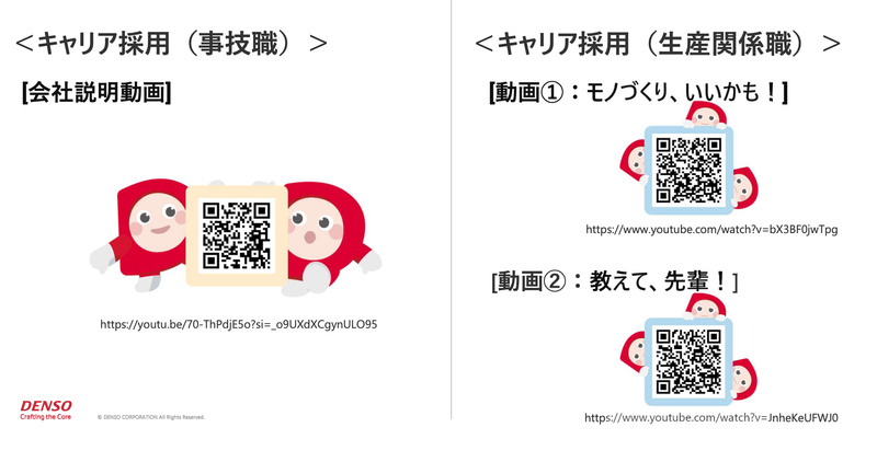 仕事内容 \\この求人のおすすめポイント// ✅年間休日121日!長期休暇あり ✅大手企業ならではの充実した福利厚生 ✅土日休みでプライベートも充実◎ ||◤仕事内容  ̄ ̄ ̄ ̄ ̄ ̄ ̄ ̄ ̄ ̄ ̄ ̄ ̄ ̄ ̄ ̄ ̄ ̄ 自動車部品等の製造作業他 (従事する業務内容は会社にて決定) をご担当いただきます。 ご経験やスキル、障がい配慮事項など により職場(勤務地)を決定いたします。 面接を通して相互理解を深め、 ご経験やキャリアを考慮しポジションを調整します。 ||◤デンソーの仕事紹介動画  ̄ ̄ ̄ ̄ ̄ ̄ ̄ ̄ ̄ ̄ ̄ ̄ ̄ ̄ ̄ ̄ ̄ ̄ 弊社の仕事について動画でご覧になりたい場合は 以下URLをネット検索ください ※またはQR画像からもご覧いただけます [動画①:モノづくり、いいかも!] https://www.youtube.com/watch?v=bX3BF0jwTpg [動画②:教えて、先輩!] https://www.youtube.com/watch?v=JnheKeUFWJ0 ⭐成長できる環境⭐ デンソーでは、一人ひとりの能力や適性を 活かせる職場環境づくりに力を入れて います。あなたの持つ可能性を最大限に 発揮できるよう、丁寧な研修制度や 先輩社員によるサポート体制も整えています! |◤働く環境について  ̄ ̄ ̄ ̄ ̄ ̄ ̄ ̄ ̄ ̄ ̄ ̄ ̄ ̄ ̄ ̄ ̄ ̄ デンソーでは、2つの”安心”を大事にしています。 1つは「安心してご応募いただくための 会社情報の開示」 2つ目は「安心して入社いただくための環境整備」 環境整備においては以下を実施しています。 ・構内設備の整備 会社構内のバリアフリー化など 足りない設備は、入社者に合わせて 改修・増設しています ・生活環境のバリアフリー化 新たに住居が必要となる新入社員のために 十分な独身寮を保有 障がいをお持ち方が生活に支障を感じることの無いよう、個別に必要な改修も行っています。 ・情報保障 手話通訳士/要約筆記者の派遣、 コミュニケーション支援ツールの提供など |◤採用実績、事例について  ̄ ̄ ̄ ̄ ̄ ̄ ̄ ̄ ̄ ̄ ̄ ̄ ̄ ̄ ̄ ̄ ̄ ̄ 現在デンソーでは約700名の障がい者が在籍し、他の社員と同じ職場・業務テーマ・人事制度の下で活躍しています。 <採用実績一例> 1.製品設計(技術) 下肢障がい 2.システム開発(技術) 上下肢障がい 3.製品開発(技術) 聴覚障がい 4.製品開発(技術) 心臓障がい 5.技術統括(技術) 肝臓障がい ||◤弊社で活躍している社員インタビュー  ̄ ̄ ̄ ̄ ̄ ̄ ̄ ̄ ̄ ̄ ̄ ̄ ̄ ̄ ̄ ̄ ̄ ̄ 【モノづくりへの情熱を、働きやすさが支える】 ー2017年入社 Tさん(聴覚障がい 生産関係職)ー 学生の時に「細かい部品をつくる」という、 一つの作品を作り上げる作業が大好きで、 ラジオを製作した時に、 モノづくりに興味が湧いたから、 この仕事を選びました。 ただ、コミュニケーションを はかることが難しい時もあります。 言葉の前後から予想して話の流れを掴み 回答していることが多かったですが、 わからない時は自分が復唱して、 相手に理解していることを伝えます。 また、(今では)会社から支給されている モバイルで音声を文字化するツールを使って、 教わる時も安心感が得られてとても助かっています。 現在は2025年11月に行われる東京デフリンピックでも、 バレーボール日本代表に選ばれるように頑張っています。 【障がいの有無は関係ない。共に創る未来。】 ー2019年入社 Kさん(聴覚障がい 生産関係職)ー デンソーでいろんな人と働いたおかげで、 人との相性に自分の障がいは関係ない と思えるようになりました。 デンソーに限らず、 どの会社でも自分の障がいをもったうえで 働き続けられるのか?不安に思うところは みんな同じだと思います。私もそうでした。 でも障がいを持っていても、 任された仕事をしっかりやることで、 周りの人が自然と助けてくれます。 見えない障がいに対する理解は なかなか得られないですが、 仕事の成果は見える形で表れるし、 それが信頼という形に変わります。 だからこそ自分のやりたいこと、 自分の譲れないところを第一に、決めてください。 【課題を解決し、貢献へ。成長を実感できるキャリア。】 ー2018年入社 Sさん(聴覚障がい 事技職)ー 2019年度のアクティブミーティングで、 災害時に音声でのコミュニケーションが難しい方の 症状確認をスムーズにするためのツール 「アクティブボード」を作成しました。 漫画的表現と手話表現のイラストを使うことで、 聴覚障がいの方でも症状を確認することができ、 スタッフ側も症状を確認しやすくなりました。 メンバーのみなさんが聴覚の方の困りごとを 受け入れてくださり、 一致団結しながら最後まで取り組むことができ、 部内の報告会でも優秀賞をいただき嬉しかったです。 ||◤ご応募の際の注意事項  ̄ ̄ ̄ ̄ ̄ ̄ ̄ ̄ ̄ ̄ ̄ ̄ ̄ ̄ ̄ ̄ ̄ ̄ 【応募完了メールが届かない場合】 ご連絡のメールが「迷惑メールフォルダ」に振り分けられることがございます。 メールが届かない場合は、迷惑メールフォルダ内をご確認いただくとともに、 [ no-reply@rct.airwork.net ] からのメールを受信できるよう設定をお願いいたします。  ̄ ̄ ̄ ̄ ̄ ̄ 