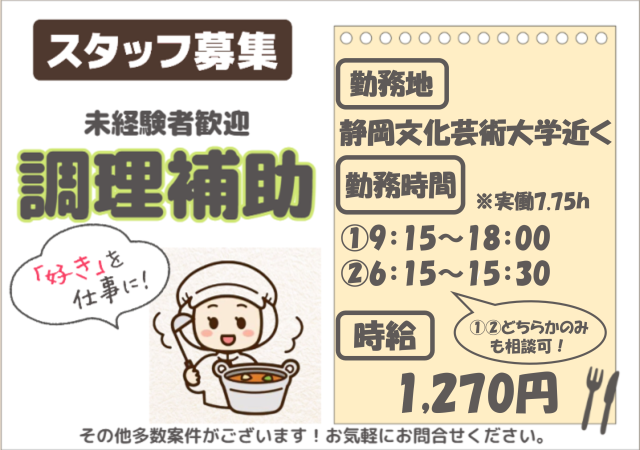 募集要項 職種 病院給食の調理補助スタッフ(料理の盛り付けや下準備等) 雇用形態 派遣社員 仕事内容 【未経験OK!家事の延長で出来るお仕事です!】 〇お食事の盛り付け 〇簡単な調理 〇食材の下処理 〇食器の片付け などをお願いします。 子育て世代の主婦(夫)さんたちも多数活躍されている病院です♪ ●久しぶりの仕事だから無理なく働きたい ●調理の仕事を始めてみたい ●家庭や子育てと両立したい ●将来安定の医療業界に興味がある など、、、 志望動機はなんでもOKです! 前職は接客や清掃・軽作業など異業種から転職のスタッフも多数活躍中です!! ハローワークでお仕事探されている方にもおすすめ! 少しでも気になった方は是非お問合せ下さい!