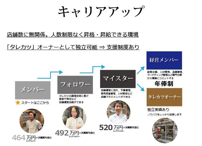 仕事内容 キッチン・ホールスタッフ接客業務全般および調理業務 *当社独自の管理職ポジション 「メンバー」としてお迎えします。 ⭐具体的な業務内容⭐ ◆接客 ◆仕込み・調理 ┗多少の調理経験があれば, 難しい技術は必要ありません。 ◆アルバイトスタッフの採用・教育 業務に関わる改善策の提案など、 これまでの経験を活かして積極的に 行ってください。 ==================== ⭐弊社のキャリアアップ制度について⭐ 一般的な「店⻑・副店長」とは異なる 職務遂行能力に応じた3ランクの職能制を導入しています。 キャリアアップすることで、 さらなる能力開発と給与アップが見込めます ▼メンバー 一般クラスの方 ・接客業務や調理など ▼フォロワー 店舗運営管理ができる方(一般的な副店長または店長相当) ・タレカツの調理技術 ・発注業務 ・店舗の運営管理など ▼マイスター 担当するタレカツ店の運営管理業務に加え、 エリア全体の管理を担える方 ▼マネージャー・経営幹部 マイスター能力に加え、タレカツ事業全体の 戦略的なマネジメント等を担える方 なお、ランクは店舗運営責任の大小や 上下関係を表すものではありません。 「メンバー」が「マイスター」に 依頼や指示を行うことも当社では普通です。 美味しい⾷事を快適に召し上がっていただく 店づくりという共通の課題に対し、 ランクにとらわれることなく社員一丸となって 店舗運営に取り組んでいます。 ========================= ⭐ラグーンインターナショナルのアピールポイント⭐ ✅主体性を重視しています 社員一人ひとりの主体性を大切にしている当社。 社員のアイデアから生まれた制度や取組みも多数あります。 職能ランクとは別に、得意な分野で会社に貢献し、 手当を得たり独自のポジションを築くことも可能です。 具体的には ◎人材教育 ◎Webなどを活用した販売促進 ◎全店舗のクリンリネス管理 ◎仕入業者の選定・交渉など 会社から求めるというより、 社員自らが率先して活動しています。 これらの活動の成果に応じて 「貢献給」を支給しています。 ※昨年度実績:10万円〜40万円。 ✅正規雇用の従業員の離職は5% 長く働けるのが当社の特徴です≫ 「働きやすさ」は社員それぞれで 異なると考えています。 ✅飲食業界の中でも成長しやすい環境 弊社独自のキャリアアップ制度は、 一般的な飲食店とは異なります。 通常は店長や副店長が埋まっており、 『なかなか出世ができない』と感じることも多いと思います。 しかし、弊社では店長などの固定ポジションを設けていないため、 第二新卒など20代の若手からでも将来的なキャリアアップが可能です。 『キャリアアップしたいが、今の職場では厳しい』 そんな思いを持つ方にはピッタリの環境です。 ✅ライフスタイルに合わせた働き方が可能 家族のことや年齢による体調の変化など、 社員一人ひとりの声を大切にし、 できる限り希望に沿った雇用条件となるよう 心がけています。 飲食業界では休みが少ないイメージがありますが、 弊社では夏季休暇を確実に取得できる環境を整えています。 また「4週6日休み(標準)」または 「4週8日休み」を選択可能です(※途中変更可)。 ✅長期的な働き方が可能 社長・役員との年2回の個別面談をはじめ、 いつでも相談できる体制を整えています。 結果として社員の離職率は5%以下です。 ⭐社員インタビュー⭐ 20代・前職:飲食店スタッフ ==================== 前職では店長やリーダーなどのポジションが埋まっており、 将来的なキャリアアップは難しいと感じていました。 そのため、ポジションに関係なく 正当に評価され、 キャリアアップしやすい社風に惹かれ、 私は「メンバー」として入社しました。 転職して大きく変わったことは、 ①役職に関係なく意見を言い合える社風であること ②お客様との距離が近く、喜びを間近で感じられること ③給与が上がったこと 職場環境が良くなったことで 仕事の視野も広がり、 スキルアップにもつながりました。 今後はさらにスキルに磨きをかけ、 「フォロワー」、ゆくゆくは 「マイスター」を目指しています。 飲食業界で働きながら、 「キャリアアップしたい」 「給与を上げたい」「将来的に独立したい」 と考えている方には、 ぴったりの職場です。 ==================== ⭐新潟名物タレかつ丼とは?⭐ 「タレかつ丼」とは、揚げたての薄めの トンカツを甘辛醤油ダレにくぐらせて、 ご飯にのせた丼です。 新潟市で100年以上愛されてきた、 玉子でとじないユニークなカツ丼です。 ⭐当社「新潟カツ丼タレカツ」について⭐ 創業から18年。 東京都内に10店舗、大阪・京都に4店舗の 14店舗を展開しています。 テレビや雑誌などでも数多く取り上げられ、 連日多くのお客様にご来店いただいています。 薄めのカツは女性でも食べやすく、 インバウンドのお客様を含む幅広い層から ご支持いただいています。 お米は新潟産直こしいぶき、 豚肉は新潟ブランド豚「和豚もちぶた」、 タレは国産有機大豆を