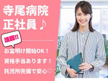 仕事内容 \ここがポイント/ ★正社員募集!充実の福利厚生で安心♪ ★資格手当あり!キャリアアップを応援◎ ★託児所完備!子育て中の方も働きやすい環境♪ *・。・。*・。・。*・。・。* <仕事内容> 寺尾病院での医療事務全般をお任せします。 ・外来受付、会計業務 ・診療報酬請求(レセプト)業務 ・電話応対、その他付随業務 *・。・。*・。・。*・。・。*