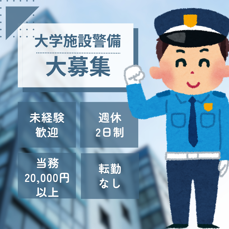 仕事内容 新しいメンバーを募集します! 大学の施設内で 巡回や出入管理業務をお任せします。 ★基本は館内警備! 冷暖房完備で快適な環境で働けます◎ ★未経験でも安心! 特に難しい業務はありません。 しっかりレクチャーするので すぐに活躍できますよ♪ <<日本環境マネジメントは地域や街の暮らしを豊かにする会社です!>> 文化芸術施設やコミュニティ、スポーツなどの街を彩るさまざまな公共施設を管理運営する「指定管理者事業」、 ビルや公園・地域施設の総合管理を行う「プロパティ・マネジメント事業」、 生活インフラを支える、「一般廃棄物管理」や「下水道管理事業」など多種多彩な事業部があります。 豊かな暮らし、安全な暮らし、 清潔で快適な暮らしといった社会インフラの根幹を圧倒的なシェアで支えています。