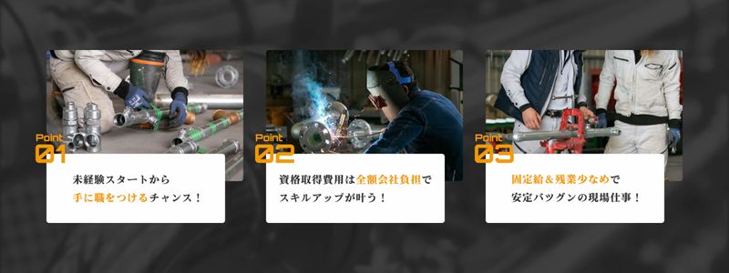 必要資格・経験 【 必須 】 〇普通自動車免許(AT限定可) 〇いずれか1つに当てはまる方 ・配管の溶接経験 ・同職種での新人教育の経験 ・現場管理の経験 <こんなメンバーが活躍しています> ・20代30代の若手も活躍中 ・経験者歓迎&ブランクOK 【下記資格や経験がある方は優遇します!】 ●玉掛け技能講習修了 ●アーク溶接特別教育 ●高所作業車運転技能講習 ●建設経験(年数不問) 最終学歴 学歴不問で誰でも挑戦可能! ―高卒歓迎 ―中卒歓迎