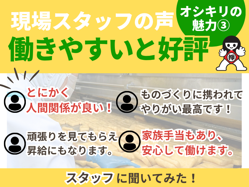 アピールポイント: / 「今すぐ働きたい!」という方から 「5月入社に向けて動いている」という方も大歓迎♪ \ 入社時期は柔軟にご相談にのりますので、 まずはお気軽にご応募ください♪ お電話でのご質問も受け付け中! ▶011-385-4451 ------------------------ ✓ 面接について 面接では、フラットにお話いただき、 あなたのお人柄を知っていければと思います! ・あなたの強み、弱み ・どうして興味をもってくれたのか など、お聞きします。 素直な気持ちをお聞かせください! ------------------------- ⭐Instagramをチェック⭐ ・どうやって食品を製造しているの? ・実際に働いている人の雰囲気は? ・面接官ってどんな人? そんな疑問を解消するために、 画像や動画で発信中! 「オシキリ食品」で検索してください♪ ▶Instagram:@OSHIKIRI_FOOD ------------------------- 【求める人物像】 ※未経験者歓迎※ 【応募条件】 ・45歳以下 <例外事由3号のイ 長期キャリア形成のため> ・日本語での業務コミュニケーションに支障のない方 (N1程度) ・手に職をつけたい方 ・食に関するお仕事をされたい方 ・新しいものを作るのが好きな方 ・チームワークを大切にできる方 ・明るく元気な方 ・UIターン歓迎 【以下に該当する方歓迎します】 ・食品製造業務の経験者 ・フォークリフト免許をお持ち方 ・生産管理に関する実務経験 または知識を習得されている方 ・マネジメント経験がある方 ・ものづくりに興味がある方 ・ピッキングなどの実務経験 ・工場での軽作業スタッフ など ------------------------- ▼現役スタッフの声 Aさん:入社14年目 転職の際は、全く別の業界を見ていましたが 求人が目に留まり面接を受けました。 面接官の方が丁寧に説明してくれたことが きっかけで入社。 入社後感じているのは とにかく人間関係が良い! 心地よい人間関係のおかげで、 14年勤務できています。 -------------------------