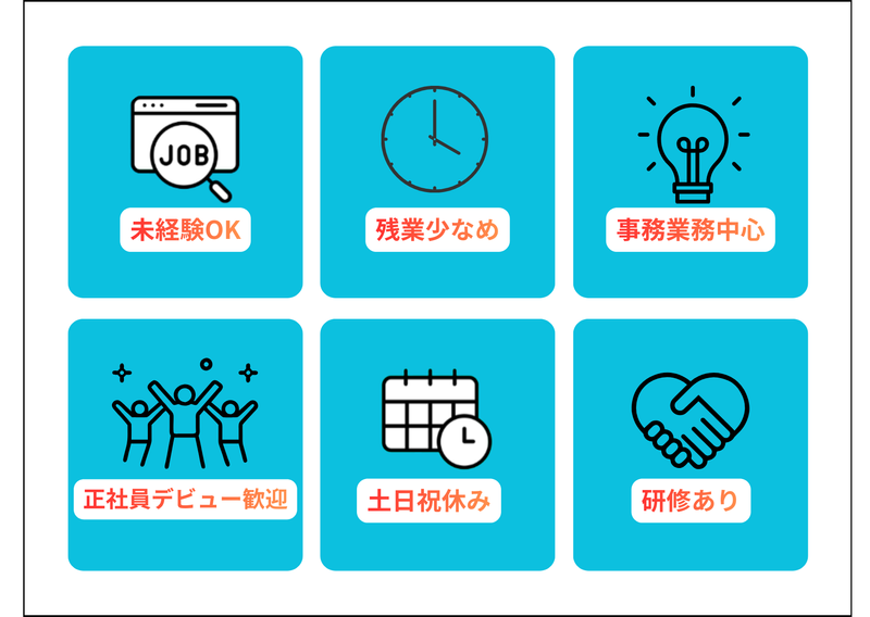 求めている人材 【必須条件】 ・普通自動車運転免許(AT限定可) ※学歴・職歴・業界経験は問いません ※社会人経験が浅い方、正社員デビューも歓迎 【こんな方に向いています】 ・未経験から事務職にチャレンジしたい ・土日祝休みの働き方を大切にしたい ・人のサポートをする仕事が好き ・安定した業界で長く働きたい ・デスクワークだけでなく、少し動きのある仕事がしたい