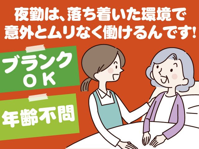仕事内容 交替制より生活リズム安定の夜勤専属介護職 ブランクOK!住宅型有料老人ホーム「ロマン」で、 正社員スタッフを募集! 落ち着いた時間帯の勤務なので 意外と無理なく働けます。 〈夜勤の働きやすさポイント〉 ━V━━━━━━━━━━━━━━━━━ ▶ 夜勤手当1回5,000円+処遇改善手当あり ▶ ブランクOK!丁寧にサポートします ▶ミドル・シニア世代多数活躍中! ▶福利厚生充実で長期安定 ━━━━━━━━━━━━━━━━━━━ 【主な業務内容】 〇夕食~就寝、起床の生活サポート 〇夜間の見回り 〇引継ぎ業務 など ※落ち着いた環境で、自分のペースで働けます。 また、仲間のサポートもあるので安心して夜間勤務に 取り組んでいただけます。 〈対象となる方〉 ・20代~60代まで、幅広い年代の方が対象 ・介護職員初任者研修修了者以上の方 ・経験の浅い方、ブランクのある方もOK 夜勤専属で効率よくお仕事しませんか!? 話を聞くだけでも歓迎! ぜひ、ご連絡をお待ちしています。 -