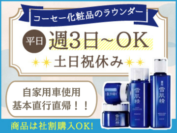 仕事内容 ⭐⭐私有車を使っての業務⭐⭐ ================ ✅乗り慣れた車で、自分のペース回れる* ✅直行直帰での勤務で通勤の負担もナシ◎ ✅ガソリン代支給・車両手当などの手当充実! ================ 【仕事内容】 ドラッグストアを回り、コーセー化粧品の商品陳列や売場づくり、新製品の紹介などをお願いします。 ~具体的には~ ・売り場のメンテナンス ・季節ごとに商品の入替作業 ・商品の配置変更 など ⛅担当エリア⛅ 千葉県柏市メインに松戸市、野田市も担当 *1日3、4店舗回ります *車通勤(基本直行直帰) ⭐扶養内OK!柔軟シフトで家庭と両立♪ ⇒月~金のうち、週3日、月12~13回程度&17時までのお仕事。残業もありませんので、「子育てが落ち着いたから、また働きたい」「家事や自分の時間と両立させたい」という方にピッタリです。勤務曜日はお気軽にご相談くださいね◎ ⭐うれしい社員割引あり! ⇒コーセーの化粧品が、お得な社員割引価格で購入できます。発売前の新商品をいち早く試せるチャンスも!美容好きにはたまらない特典です♪ ✨未経験でも安心のサポート体制✨ ――――――――――――――――― 美容の知識やお仕事の経験は一切問いません。「コスメが好き」「やってみたい」という気持ちがあれば大歓迎!入社後の研修や、先輩との同行を通じて、商品の知識からキレイに見せる陳列のコツまで、丁寧にお教えします。安心して飛び込んできてくださいね! ✨あなたのセンスが、売り場を輝かせる✨ ―――――――――――――――――――― 慣れてきたら、あなたのアイデアやセンスを活かして、お客様が思わず足を止めてしまうような素敵な売り場を作ってください。「この商品をここに置いたら、売上が上がった!」そんな結果が見えた時、大きなやりがいと達成感を感じられるお仕事です。 ✨コーセーグループについて✨ ――――――――――――――― コーセーグループは「美の創造企業」として、美を追求し、大切な人々と地球を守るため、社会・地球環境の課題に向き合い続けてきました。これまでのノウハウを活かして、健やかな地球の未来に向けて貢献していくことを目標にしています!ぜひあなたも売り場づくりを通して、当グループでの成長を感じてくださいね。