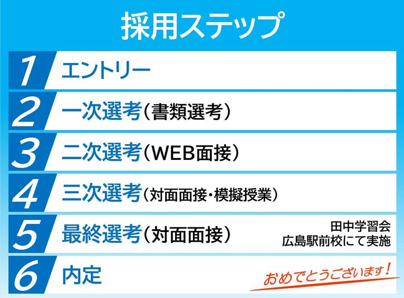 求めている人材 【必須条件】 ・大卒以上 ・大学受験経験のある方 【歓迎条件】 ・教育に携わりたい意欲のある未経験の方 ・教員免許をお持ちの方、または受けられた方 ・雇用形態は問わず、予備校や進学塾、 家庭教師、個別指導教育等の指導経験者 \こんな方に、ぜひお会いしたいです/ 1. 学校現場での働き方に悩んでいる方 「部活動の指導で休みがない」 「カリキュラムに追われて生徒一人ひとりと向き合えない」 ……その悩み、田中学習会が解決します。 地域密着だからこそ、生徒の個性に寄り添った指導が可能です。 2. 異業種で「誰かの役に立ちたい」と感じている方 営業職やサービス職など、教育業界以外からの転職者が多数活躍中! 「聞き上手」「褒め上手」なあなたのスキルは、 子どもたちの可能性を広げる武器になります。 3. 安定とキャリア、両方手にしたい方 生徒数13,000名超。 大手英進館とのパートナーシップにより、 経営基盤は盤石です。 将来は教室運営(マネジメント)に携わり、 ビジネススキルを磨ける道もご用意しています。