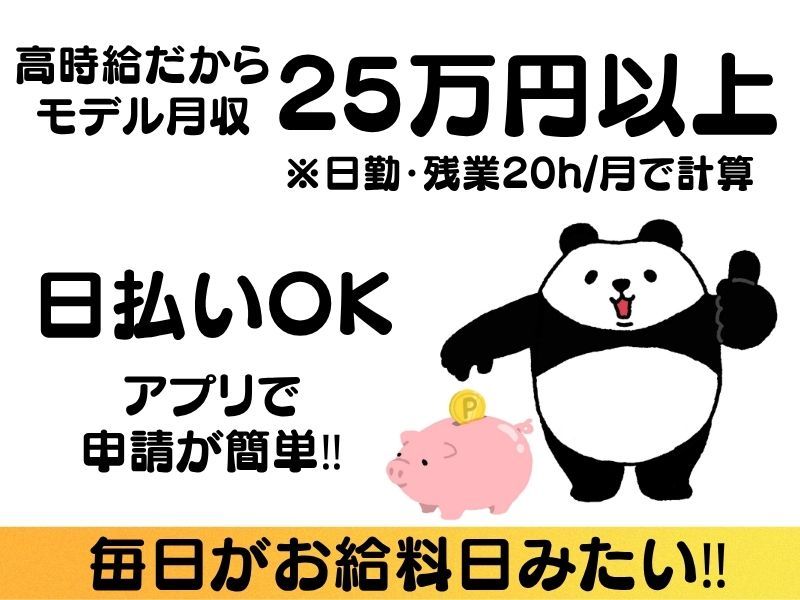 アピールポイント: \\カンタン作業で1日1万円以上// 1人作業メインで気楽! もくもくとできる単純作業 土日祝休・長期休暇あり!オフ充実! * 未経験OK!気軽にスタート * 空調完備の快適環境 * お弁当注文OK * 自販機・ロッカー・更衣室・休憩室あり * 髪色・髪型自由・ネイルOK * 日勤×土日祝休み * 長期就業可能 * クルマ、バイク通勤OK! * 作業服貸与あり(作業着での出勤もOK) <日払い・週払い利用OK> \まるで毎日が給料日/ \\利用者急増中// \アプリで簡単申請/ お気軽にご相談くださいね!