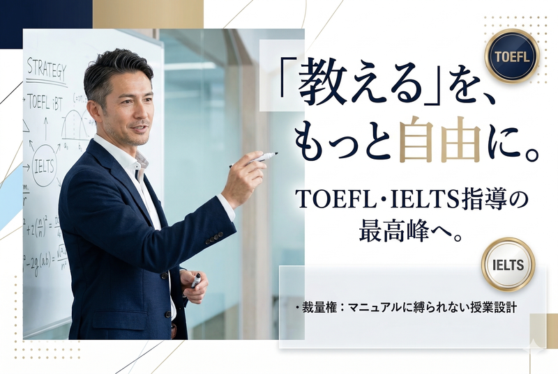 仕事内容 ■ 働くメリット ━━v━━━━━━━━━━━━━━━ 「高待遇」×「柔軟性」を両立! ✅初日から時給3,000円〜5,000円 あなたのスキルを最初から正当評価。 ✅週1日(日曜)のみで完結 14:00~18:00の2コマ~ 本業や研究、家庭との両立に最適です。 ✅スキルの維持・向上に最適 TOEFLやIELTSなど高度な英語に 触れ続けられる、知的な環境です。 ✅副業・Wワークも歓迎 大学の非常勤講師や他校との 掛け持ちも柔軟に対応いたします。 ■ 仕事内容 ━━v━━━━━━━━━━━━━━━ 英語圏への留学や、国内難関校を 目指す生徒たちの「夢」を支える仕事です。 ・TOEFL / IELTS / SAT / 英検等の 資格試験対策の授業 ・国際系大学を中心とした入試指導 ・1コマ100分の集団授業がメイン \ここがポイント/ 授業の進め方は講師の裁量にお任せ。 マニュアル通りではない、 あなたの個性を活かした授業が可能です。 *集団授業がメインです(個別指導の場合もあり) *大学・大学院進学を目指す中高生が指導対象です。 = 例えばこんなスキルが輝きます = ・集団指導の経験がある ・英語スキルがある ・TOEFLの指導経験がある 特にTOEFLの指導経験を3年以上 お持ちの方は即戦力! スグに活躍できます◎ ◆◆◆私たちの想い◆◆◆ 私たちは「世界で戦える日本人」を 育てる、日本屈指の予備校です。 あなたが培ってきた「生きた英語」を 次世代の若者のために活かしませんか? 生徒と共に高め合える、 最高の舞台を用意してお待ちしています。
