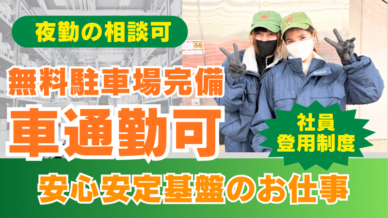 【保険制度】 雇用保険、労災保険、健康保険、厚生年金 待遇・福利厚生 【福利厚生】 ◆交通費全額支給 ◆制服貸与 ◆社会保険完備 ◆車通勤OK ◆無料駐車場完備 ◆資格取得支援制度 (フォークリフト免許など取得可能) ◆定期健康診断 ◆2年後社員登用有 ◆手当:土日祝1500円/日