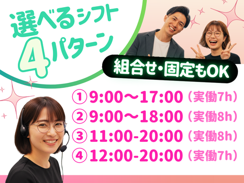 シフト制 勤務時間詳細 (1)09:00~17:00(実働7h) (2)09:00~18:00(実働8h) (3)11:00~20:00(実働8h) (4)12:00~20:00(実働7h) 上記4パターンから選べます。 ※組み合わせもOK! ✅週4日~勤務OK ✅曜日固定シフト ✅平日のみ勤務OK / 4月末までの 短期も相談OK \ 短期希望の方は 「(1)9:00~17:00」のみの ワンシフトとなります◎