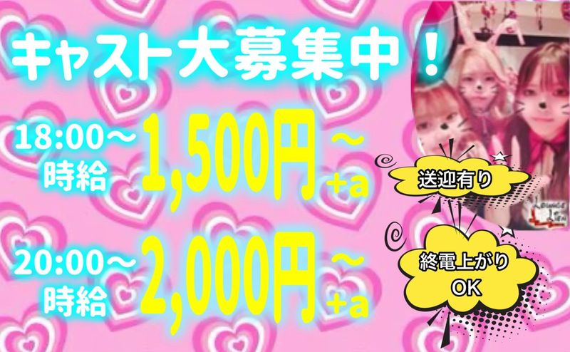 アピールポイント: ◎未経験者大歓迎! ナイトワークが初めての方も安心して働ける環境です。 ◎体験入店OK お店の雰囲気を見てから決められます。 全額日払い制となります。 ◎衣装レンタルあり ワンピースなど無料レンタル可能なので 衣装を購入する必要はありません。 ◎自由シフト ・22時から出勤OK ・終電上がりOK ・週1日~勤務OK ・他の店舗終了後の24時から働きたい など会社員・学生のかけもちやWワークにもぴったりです。