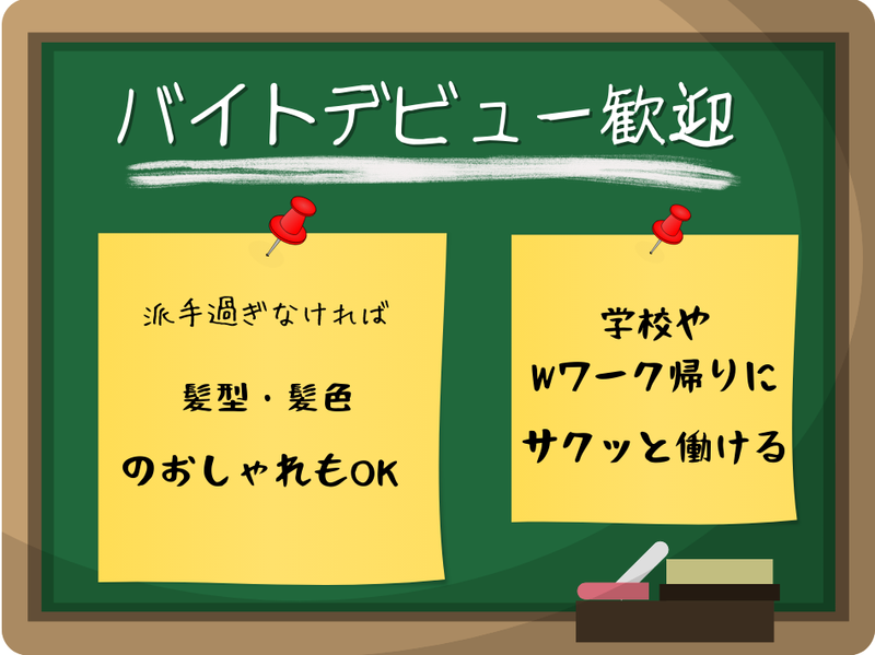 職場環境 \ 学生多数活躍中のお店です / 未経験から始めたスタッフばかり、 あなたも安心してご応募ください! イチから丁寧にお教えするので、 バイトデビューでも大丈夫ですよ。 せっかくバイトをするなら 楽しく働けるところが良い! そんな方にオススメです。
