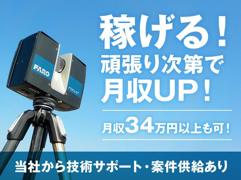 仕事内容 あなたも「手に職」をつけて、 安定した収入と自由な働き方を手にしませんか? 今、測量は「デジタル測量」へと変化。 従来の測量とは違い3Dスキャナなど、最新のデジタル技術を使って地形を正確に記録。 国が推進する分野のため需要も高く、安定性も抜群。 何よりも全くの未経験から資格もなしにチャレンジできる仕事になりました。 「技術を身につけたい」 「手に職をつけたい」 「独立したいけど、少し不安がある」 「やった分だけ稼ぎたい!」 そんな方にはぴったり。 現場での撮影とPCでのデータ処理を組み合わせた“スマートな仕事”で、市場価値の高いスキルを獲得できます。 【仕事内容】 地上型3Dレーザースキャナーを用いて、戸建て住宅の建設に欠かせない基礎データを高精度で提供して設計、施工の向上に貢献できる仕事です。 【具体的な業務内容】 ・最新鋭の設備(3Dスキャナー)を使用し、 戸建て住宅を中心に地形の高さ、長さ、面積などを測量、データ収集 ・ベトナムのCADセンターへの作図指示業務、またそれらの成果品のチェック及び納品業務 測量機械を使用すると、人の経験値・技量に左右されない図面が作成できます。 業務は簡略化されていますが 経験知識を積み、最新技術を使いこなす力を 身につけられるため、 市場価値を高めることも可能です!
