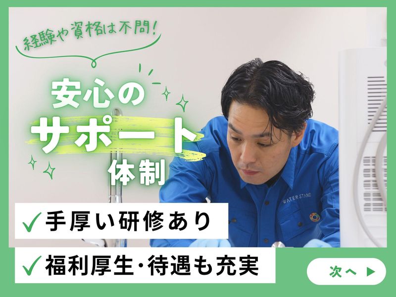 仕事内容 / 未経験でも大丈夫! 心機一転、始めてみませんか? 初めての転職も応援します◎ \ . 業績好調の "ウォータースタンド" 男性スタッフが多数活躍している職場です! 30代~40代の方も活躍中! まずはお気軽にご応募ください! . ================= この求人のポイント♪ ================= ◆経験・スキル不問! <普通免許があればOK>です☆ ◆年間休日<120日以上!> ◆未経験も安心の<サポート体制完備♪> ◆<スーパーフレックス制>で 理想の働き方が実現♪ ◆ノルマはありません!! . . ================= 仕事内容はこちら! ================= ✅設置・交換・撤去・修理  ̄ ̄ ̄ ̄ ̄ ̄ ̄ ̄ ̄ ̄ ̄ ̄ ̄ ご契約されたお客様先にて ウォータースタンドの設置を行います! 設置・修理・お手入れ方法の ご説明などは 入社後にしっかり研修を行うので どなたもご安心くださいね♪ . ✅サーバーメンテナンス  ̄ ̄ ̄ ̄ ̄ ̄ ̄ ̄ ̄ ̄ ̄ ̄ フィルター交換や作動チェックなど 既存のお客様先にて メンテナンスを行います! 1件40分ほどの時間が掛かるので お客様とのお話しを楽しみながら 作業をお願いします♪ お客様は法人から個人まで幅広く、 法人の場合は自治体と協定を結んだり "給水スポット" として さまざまな場所に設置されることも多いため、 「別の店舗でも利用したい!」 「友達の家でも利用したいと言っている」とご紹介をいただくケースもございます。 設置~アフターフォローまで一貫して担当できるので お客様との信頼関係もバッチリ★ . 上記業務をお任せします! 「ノルマ」は無いので ご安心くださいね♪ もちろん、 社用車や制服 タブレットや携帯電話などの 業務に必要なものは貸与! . . ================= 安心の<サポート体制!> ================= ◆入社後、まずは座学研修で 商品知識や訪問マナーなどを 基礎から丁寧にレクチャーします! ◆座学研修後は、OJT研修で 先輩に同行し実際の現場を 学んでいただきます! ◆独り立ち後も 階層別の勉強会や研修を実施♪ . 更に・・ 週に一度、 上長との面談を設けています。 ◎実務上のトラブル解決方法 ◎アドバイス・フォロー などなど・・ 些細なことから 相談できる環境が整っています♪ 安心してご応募ください☆ . . ============== <直行直帰>可能! ============== ご自宅から直接 お客様先へ訪問をし、 そのまま直帰OK! 勤務時間や休日は 自分で決められるので 週休3日の働き方も◎ フレックスタイム制ならではの 働き方が実現可能です♪ あなたが「働きやすい!」と思える ワークライフを見つけていきましょう! . . ============== 1日のスケジュール例 ============== 9時 自宅から出発! 近くのマンションで2件設置 12時 ランチタイム♪ 13時 新規のお客様先へ移動 14時 設置作業で1件訪問 15時半 機種変更希望のお客様先へ訪問 商品の交換と使い方の説明もします 17時 自宅へ直帰♪お疲れ様でした! . あるスタッフの1日の例ですが 上記のような働き方が可能です♪ . . =============== ウォータースタンドについて =============== 当社は、 「 2030年までに日本の 使い捨てプラスチックボトルを 30億本減らします。 」 というミッションを掲げ マイボトルを携帯する 新しい文化を創り、 気候変動とプラスチックによる 環境問題改善に取り組んでいます! 一般のお客様だけでなく 官公庁や公共施設、 企業などのお客様からも 幅広く支持いただいております♪ このような信頼のもと 事業は右肩上がりで成長中! . ☆SNSでも話題のウォータースタンド☆  ̄ ̄ ̄ ̄ ̄ ̄ ̄ ̄ ̄ ̄ ̄ ̄ ̄ ̄ ̄ ̄ ̄ ̄ . // あなたのご応募を お待ちしております! \\