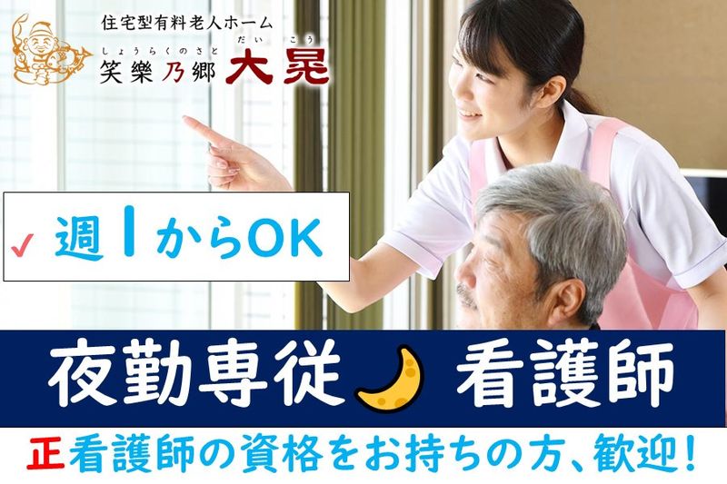 【仕事内容】 訪問看護ステーション「看護」スタッフ募集!(夜勤専従) 2名体制の夜勤です。 週1日からOK!たくさん働きたいのご希望も大歓迎です!WワークもOK!介護施設未経験の方も歓迎です! 【PRポイント】 ・心からの感謝の言葉を貰えるお仕事です ・一人ひとりと向き合う寄り添った介護が可能 ・スタッフ間のチームワークと雰囲気の良さ! ・チームで支え合い、成長できる環境! ■具体的な仕事内容 併設するナーシングホームでの訪問看護のお仕事です。 ・看護業務 ・利用者様の巡回と安否確認 ・介護看護記録 ・起床時の介助やお手洗い誘導 など ■笑樂乃郷 訪問看護ステーション(しょうらくのさと) 大晃グループでは、介護・看護・事務すべての職種で有給休暇が「半日単位」から取得可能です。 お子さまの学校行事や急な用事にも合わせて柔軟にシフトを調整できるので、子育て中の方も安心して働けます。 また、私たちの合言葉は「助け合い・支え合い」。 スタッフ同士が自然とフォローし合える風土があり、実際に多くの子育て中のママがイキイキと活躍しています。 ■実務未経験の方も歓迎です 先輩スタッフが、一から丁寧にサポートします。ブランクのある方も、もちろん安心して働けます。 ■お気軽にお問い合わせください。 ぜひご応募くださいね。 いきなりの面接は不安な方には施設見学も大歓迎です。 働き方の相談や、仕事内容のご質問などのお問合せもお気軽にご連絡ください。 入職時期が2、3ヶ月後の方も遠慮なく、施設見学承っています。先ずはメールでお問い合わせ下さい。