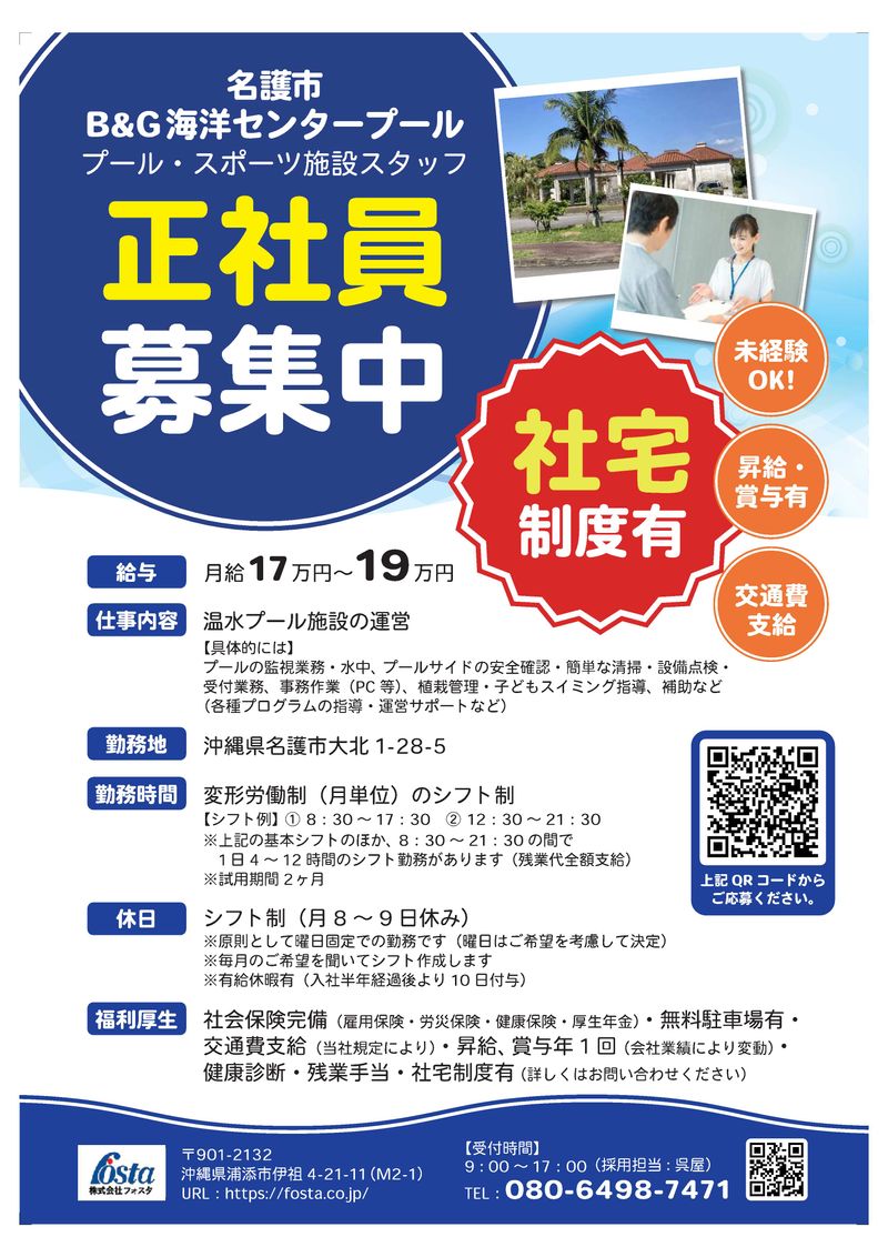 仕事内容: <アピールポイント> 嘉手納町・読谷村・うるま市から通える方大歓迎! ✬ 未経験OK!水泳が好きな人歓迎! 安定企業で正社員として活躍 ✬ 午後出勤もアリのシフト制 ✬ 月8日休みでオフも充実! ✬ 昇給・賞与あり(会社の業績により変動) ✬ 会社補助付きの社宅あり(名護市外の方) -------------------------------- 【職場について】 名護市の市民プールとして お子様からご年配の方々まで幅広く ご利用いただいている 《名護市B&G海洋センター》の 温水プールでのお仕事です。 25mプールの他に、ジャグジーや子供プール、 多目的ホールなどの設備を備え、 子供スイミングや水中運動、また多目的室での サーキットやパーソナルレッスンなどの プログラムを開催。 市民の皆様の健康づくりを応援しています! 【仕事内容】 温水プール施設の運営にかかわるお仕事です。 <具体的には> 〇 プールの監視業務 〇 水中・プールサイドの安全確認 〇 簡単な清掃 〇 設備点検 〇 子供スイミングなど 各種プログラムの運営サポート などをお願いします。 水泳が好きな方なら未経験でもOK! スイミングのコーチ経験や、 プールやビーチで監視員の アルバイト経験がある方はさらに歓迎! 安定企業の《正社員》として 長く働けるお仕事です。 ぜひご応募ください! -------------------------------- <最短1分で応募完了> 『電話応募』もしくは、 画面下の『応募画面へ進む』ボタンを押してカンタン応募。 応募〜採用まで、最短3日程度でご案内しております。 -------------------------------- 【雇用形態】 正社員 ※試用期間:2ヶ月(期間中の待遇変更なし)