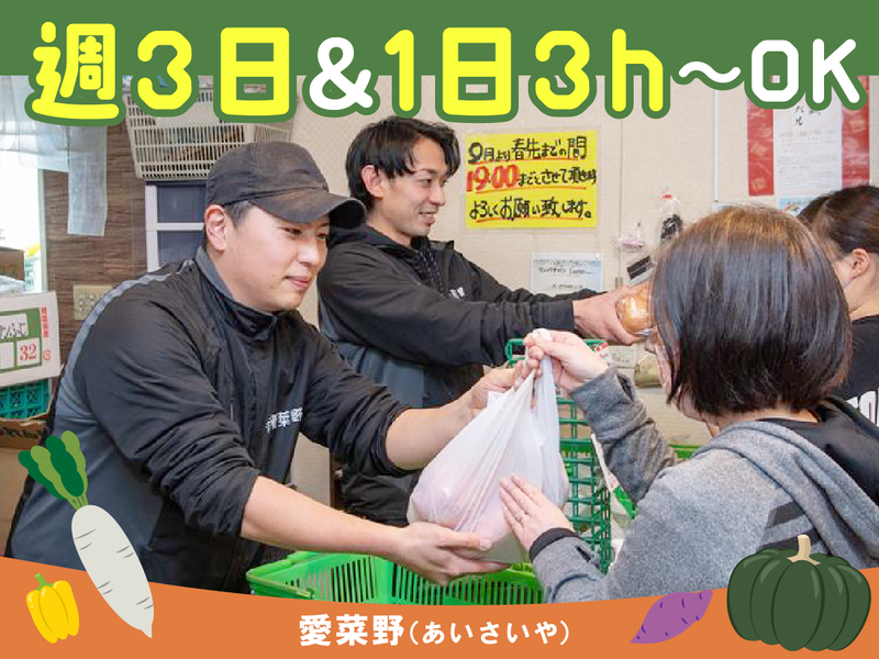 仕事内容 <この求人のポイント> ✅週3日~OK!1日3時間から働ける♪ ✅未経験OK!青果店経験者は優遇あり ✅従業員特典30%割引♪ ✅車・バイク・自転車通勤可でラクラク ✅頑張りに応じて寸志あり (年2回実績あり) ………………………………………………… |◤ 具体的な作業内容 ◢| ・レジでのお会計対応 ・お客様への明るい接客 ・野菜や果物の袋詰め ・売り場の簡単な整理整頓 決まった流れに沿って進めるため、 未経験の方でも覚えやすい仕事です。 ■地域で愛される八百屋スーパー 野菜の品揃えと、 お客様に寄り添った親切な接客が 評価されている人気店です。 元気で明るい接客ができる方が イキイキ活躍できる環境です。 ■接客を通して自然と知識も身につく 旬の野菜や果物、 おすすめの食べ方なども 働きながら自然と詳しくなれます。 日々の買い物にも役立つ知識が 増えますよ! ■経験者はスキルを活かせる環境 八百屋や青果店での経験がある方は これまでの経験を活かして活躍可能。 もちろん未経験の方も、 先輩がしっかりフォローします! ………………………………………………… ✨未経験でも安心スタート!✨ 経験不問!ブランクOK! 週3日~、1日3時間から勤務可能! ライフスタイルに合わせて働けるため、 家事やプライベートとの両立、 Wワークとの掛け持ちも可能です! 無理なく続けられる環境で、 地域のお客様に喜ばれる レジスタッフとして活躍してみませんか? HP:https://www.aisaiya.jp/ インスタグラム:aisaiya906