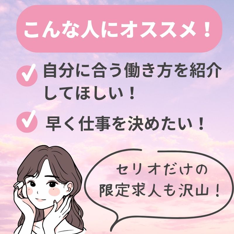 勤務時間・シフト詳細 09:45~17:45 ・シフト柔軟/週4~5日 ※長期休暇でのお休みも相談OK! ・9:45~17:45(早番) ~下記も相談OK~ ・13:15~21:15(遅番) ・9:45~20:15の間で混合シフト ※実働7時間ですが、希望される場合は実働8hでも相談OK! ・残業少なめ(月6~10時間程度) ※接客が長引いた場合のみ発生します。 ━━━━派遣で働く魅力━━━━ ・アルバイト・パートより時給が高い ・40代・50代の主婦・主夫が働きやすい ・フルタイムや副業(時短・短日数)と幅広い ・条件に合った職場で働ける…など 。.・セリオなら希望が叶う・.。 あなたの希望に合った働き方を、 弊社がサポートします。 sacasoは、ライフスタイルに合わせた 柔軟な働き方を応援する派遣会社です! 短期や長期など様々な働き方に対応し、 学生さんから主婦(夫)さんまで 幅広いニーズに応えます。 さらに、スキマ時間やWワークとしても 活躍できる、期間限定のお仕事や 週3日~勤務OKのお仕事などの 様々な求人もご紹介しています。 また、前職がカフェ、ホテル、病院、 学校事務、在宅、コンビニ、飲食店で 正社員・アルバイト・パートから 派遣デビューした方も多数いらっしゃいます。