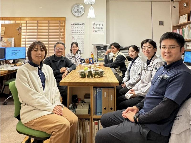職場環境 事務員1名、設計施工管理5名の 計6名体制。平均年齢36歳。 年齢問わず経験を重ねた技術者が在籍。 個々の裁量を尊重しつつ、 相談やフォローもしやすい距離感です。