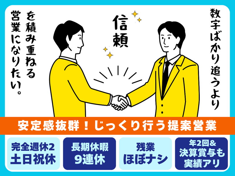 仕事内容 \ワークライフバランス重視できる環境/ ✨9連休も!夏季・冬季長期休暇が充実 ✨残業ほぼなし◎土日休みの完週休2日 ✨お客様との信頼関係を育てる営業♪ ✨あなたの経験をしっかり給与に反映◎ ✨定着率◎長く続けるメンバー多数! =================== マンションやビルの建設現場における 基礎工事を、法人のお客様にご提案します。 30年以上の歴史を持つ当社では、 長いお付き合いのあるお客様が多数。 紹介や既存取引を中心に、信頼関係を じっくり育てていく“提案型営業”が 基本スタイルです。 【具体的な業務内容】 ・大手ゼネコンや地元の設計事務所 との打合せ ・提案書・見積書などの資料作成 ・既存顧客への定期訪問・フォロー 教育期間もあるので、ブランクのある方も 安心してスタートしていただけます。 一人立ちまで2年ほどを想定していますが その後もしっかりフォローしていきます。 ゆくゆくは、 ・工事スケジュールの調整や各種手配 ・現地確認や簡易な調査業務 にも仕事の幅を広げていってください。 ◆業務のペースが掴めてくると、 自分の裁量で仕事が進められるように◎ 提案の仕方や業務効率など 工夫のしがいがある所も面白さの一つです。 ー <⭐信頼関係で築く営業スタイル> モノではない商品を売るからこそ、 お客様との関係構築が仕事のひとつ。 親交を深めながら「信頼」と「繋がり」を 少しずつ積み重ねていってください。 リピート率も高く「またお願いするね」と 言っていただけるのが何よりのやりがいです。 <⭐残業は月平均10時間未満!> 急な残業もほとんど無く、スケジュールの 管理もあなた次第です。 メリハリ意識の高い社員が多いので みんな18時~19時には退社しています。 家族との時間や趣味の時間など、 プライベートも大切にできますよ! <⭐高給与+賞与年4ヶ月+決算賞与> 営業経験者の方は月給28万円スタート、 さらに経験・年齢・家族構成などを しっかり考慮して給与決定します。 年2回の賞与は昨年度実績で4ヶ月分支給! 加えて、決算賞与も業績により 毎年支給しています。 ー 【株式会社エイトンについて】 創業から30年以上。 「地盤改良」「基礎工事」など、建物の 安全に関わる専門企業として数多くの 実績を積み重ねてきました。 認知度と共に、ニーズと業績が 順調に伸びている今、中長期的な 組織体制の強化を図るために 新しいメンバーを募集します! 現在、異業界の営業経験者をはじめ 販売職や接客業など異職種から 転職してきたスタッフも 多数活躍しています。 それぞれの個性や経験を活かしながら、 困った時にはお互い助け合えるチームです! 少しでも気になったら、 お気軽にご応募・お問合せください◎