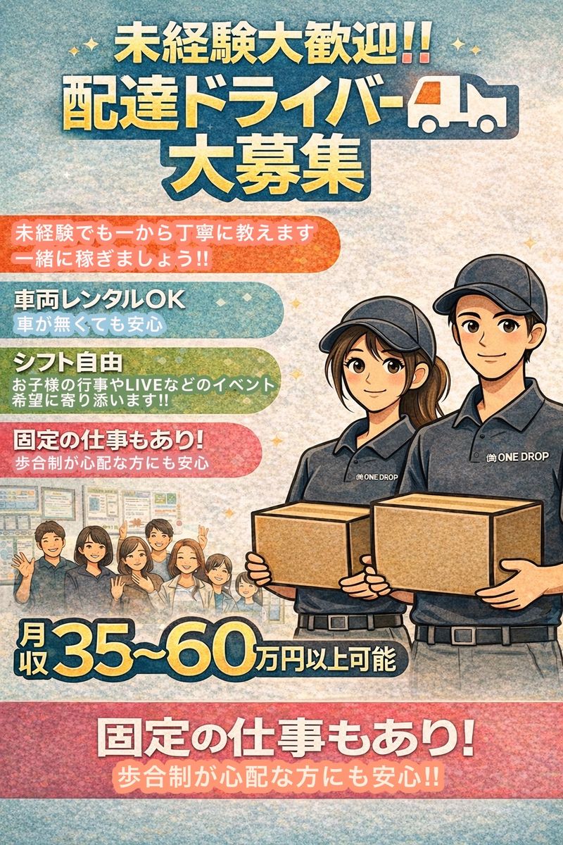 仕事内容: タイトル 【月収40万円以上可】軽貨物ドライバー/週5〜6日で安定収入! 仕事内容 大手ECサイトや通販の商品を、倉庫から積み込み、個人宅や企業へ配送していただきます。 安定案件が豊富で、しっかり稼ぎたい方にピッタリ! しっかりと稼ぎたい方! 1日のお仕事で18,500〜20,000円 午前中や夕方から夜便の配達だけ可能な方 5,000〜10,000円 給与 ★25日稼働で月収50万円可能 ★出来高制案件もあり 勤務時間 8〜21時 ★シフト制(週5.6)/直行直帰OK 応募資格 * 普通自動車免許 * 未経験歓迎・学歴不問 待遇 * 車両貸出あり(リース可) * 日払い・週払い応相談 * 独立支援制度あり