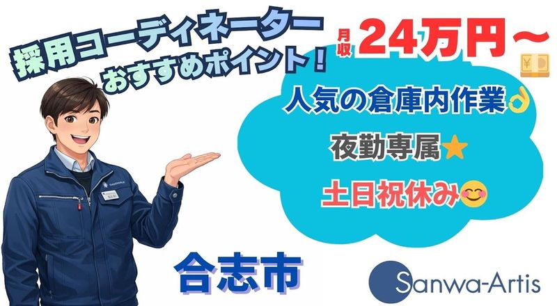 仕事内容 \「簡単」「シンプル」作業/ どなたでも”始めやすい”です♪ ✨土日祝休みの完全週休2日制 ✨20代~40代のスタッフ多数活躍中 ✨冷暖房完備で年中快適空間 ✨未経験でも安心の研修制度 ✨残業でしっかり稼げる ✨カップル・お友達同時応募も歓迎 ✨スピード面談&スピード採用あり ー お仕事内容 ー 冷暖房完備の倉庫内にて、 入庫・出庫業務やピッキング作業を お任せします。 ※重量物があります! 【具体的には】 ✅納品された部品を開梱する ✅納品棚まで台車で運ぶ ✅部品を梱包 ✅コンテナに乗せる などなど・・・ ◆ライン作業ではないので、 自分のペースでお仕事ができます! ◆キレイな工場内での作業なので 制服が汚れる心配もありません♪ ・・・・・・・・・・・・・・・・・・・・ 前職は美容師・パチンコスタッフ など、多くの異業種さんから、 転職の相談を受けています。 「自分でもできるのかな‥」 と、最初は不安そうな表情です。 1ヶ月後には 「転職を決めて良かった!」 と嬉しい言葉を聞けるように 私たちサンワアルティスがいます! 一度、頼ってみませんか? 「お仕事が気になる」という方は 応募前の職場見学ツアーも 随時行っていますので まずはお気軽にご相談ください♪ <オンライン面談随時受付中!> スマホがあればどこでもOK! お家にいながら面談できます♪