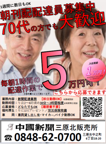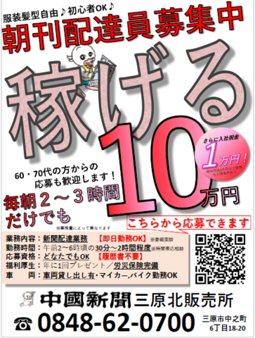 仕事内容 \中国新聞販売所の求人ページへようこそ!!/ 今回は、新聞配達スタッフ(朝刊)の募集しています! *経験不問・資格不問・学歴不問(高卒中卒OK)・年齢不問・性別不問 *主婦(夫)、ママ(パパ)さん、フリーター、ミドルの方々も活躍中! *新聞配達未経験でスタートした方も多数活躍中! *バイトデビュー歓迎!副業、かけもち、WワークOK! あなたにお任せしたいお仕事は、 それぞれに割り当てられた担当区域のご家庭や事務所などに新聞をお届けするお仕事! あなたのミッションは、 「誤配や不配することなく、読者の元に確実に配達すること!」 この業務のみなので、配達先やルートさえ覚えてしまえば簡単です! 知識なし、スキルなしの未経験の方でもすぐに慣れることができるかと思います。 仕事に慣れてくると、「1分間で何件配達できるか?」「素早く配るための最短ルートをあれこれ試してみよう」「今日は自己最高記録更新した!」など工夫を楽しみながらお仕事することもできますよ♪ 時には、お客様から「ご苦労さん!」「いつもありがとうね!」などと声をかけて頂くこともあり、そんな時は配達で消費した体力ゲージが一気に全回復するほど嬉しかったり、、ということもあります^^ 【新聞配達スタッフの仕事の流れ(例)】 3:00 出勤 3:15 自転車、バイクに新聞を積み込む 3:30 新聞配達業務開始 5:30 配達終了・退勤 ※配達する部数などで時間は前後します。 6:00 帰宅 配達先やルートなど覚えるまでサポートしますので安心ください! 【このような方も大歓迎!】 ・早寝早起きを習慣づけたい ・未経験でもスグに慣れることのできる仕事をしたい ・一人でコツコツ黙々と自分のペースで取り組める仕事をしたい ・早起きが得意 ・たまには早起きして時間を有効活用したい ・拘束時間が短い仕事でちょこっとお小遣い稼ぎをしたい ・体力があり、比較的素早く動ける ・精神的に楽な仕事をしたい ・下記のエリアから勤務中の方も在籍中!通いやすい主な地域はこちらです 〇三原市中之町 〇三原市深町 〇三原市八坂町 〇三原市八幡町 〇三原市東町 〇三原市本町 〇三原市城町 【待遇・福利厚生】 ・入社祝金あり(勤続3か月後) ・即日勤務Ok ・履歴書不要 ・学歴不問 ・週休制度あり ・バイク、車両持込可 ・バイク、車両貸し出し可 ・傷害保険完備 ・労災保険完備 ・年に一度のプレゼント支給あり ・学生奨学金制度あり 【勤務時間・休日】 午前1:30〜6:00の間で1日1~2時間程度 週3日から勤務OK ※希望の時間、日数、曜日などお気軽にご相談ください♪