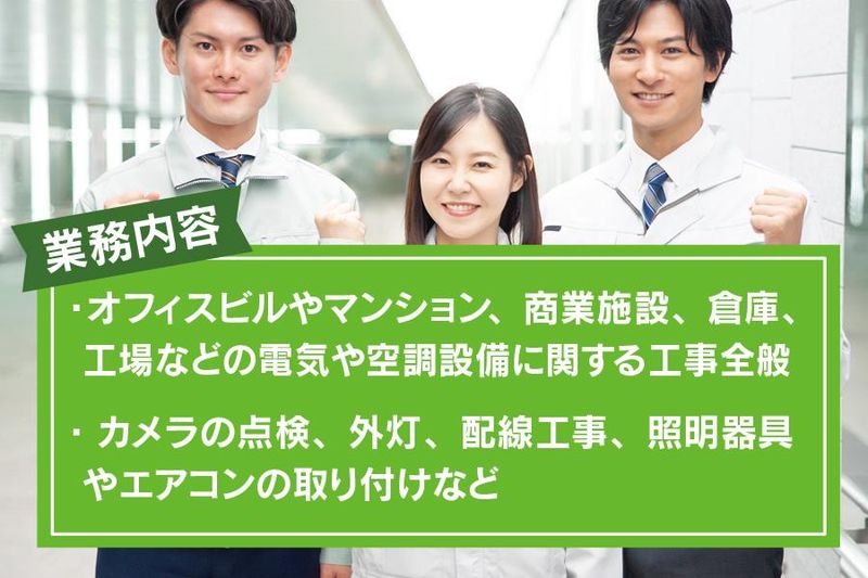 求めている人材 <必須要件> ・普通自動車運転免許(AT限定可) ・未経験者の場合、35歳まで (例外事由3号のイ:長期雇用によるキャリア形成のため) <歓迎条件> 電気工事のご経験をお持ちの方 電気工事士の資格をお持ちの方