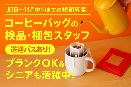 仕事内容 コーヒー業界の優良企業! キレイな職場で気持ちよく働けますよ! 香ばしいコーヒーの香りに包まれながら、 人気ドリップコーヒーの検品・梱包をお任せします。 作業はとてもシンプルで、未経験の方でもすぐに覚えられる内容です! コーヒー業界の優良企業で、清潔感のあるキレイな職場環境も自慢◎ 【お仕事内容】 ◎ ドリップコーヒー製品の検品・梱包 ◎ 完成品のパッケージ詰め・仕分け ◎ 軽作業中心で体への負担も少なめ 【ここがポイント】 ● 短期でサクッとお小遣い稼ぎにもピッタリ ● 未経験・ブランクOK! ● シニア層やWワークの方も多数活躍中 ● 週3日~勤務OK ●送迎付きで通勤ラクラク!