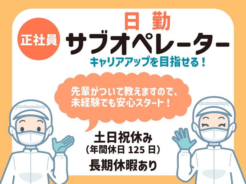 仕事内容 製造ラインを支えるオペレーター補助スタッフを募集しています。 日々の製造工程がスムーズに進むようサポートする、やりがいのあるお仕事です。 ★主な業務内容 資材の準備、機械操作の補助、作業場の清掃、製品の検品、日報の作成など、 製造現場を支える業務をお任せします。 作業は常に2名体制で行うため、分からないことはすぐに確認できる環境です。 未経験の方も安心して業務に取り組めます。 経験を積めば、製造オペレーターへのステップアップも可能。 日々の頑張りは評価制度を通じて、しっかりと還元されます。 未経験からでも無理なくスタートでき、長く働ける職場です。