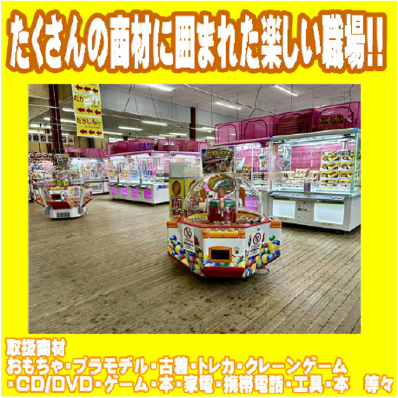 アピールポイント: <まず意識してほしいのは、楽しむこと!> いきなり全部を覚える必要はナシ! 興味のある分野/面白いと思った部門の 商品に特化して覚えていってもOKです。 そうして毎日楽しみながら スキルを身につけていってください。 <面接では肩の力を抜いてお話ししましょう> 人柄を重視した採用を行いますので 堅苦しい準備や受け答えは必要なし! あなたの好きなことや趣味について フランクにお話ししたいです! 【厳しいルールがない職場です】 スタッフを縛り付けるルールはナシ! ・髪色・髪型自由 ・服装やピアス、ネイルなどは自由 ・喫煙スペース完備 など、ノビノビ働いていただける 環境を整えています。 「こんな自由な考え方の会社はなかなかない!」 「入社から3年、働いていたというよりは 遊んでたという実感が強いです(笑)」 そんな嬉しい声も多く上がっていますよ。 【こんな20代・30代が活躍中】 Kさん:アパレル部門所属! 買い付けのために海外へ行くほど、 情熱を持って働いています。 Tさん:カードゲーム(MTG)のガチ勢! 毎週金曜はフライデーナイトという イベントに参加するためにお休みしています。 Kさん:大のバスフィッシング好き! 大会で優勝するほどの実力者です。 東金市・八街市にお住まいの方多数活躍中のお店です!
