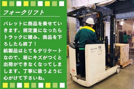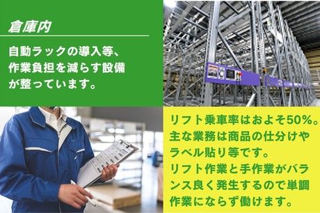 仕事内容 入出荷保管業務をお願いします。 あなたの経験を活かしませんか? 倉庫内で紙製品や日用品の入出庫に関わる作業をお願いします。主な業務は、商品の仕分けやラベル貼り、パレットの整理などの作業に加え、小型のカウンター式フォークリフトを使用した作業も含まれます。リフト乗車率はおよそ50%で、フォークリフト作業と手作業の仕分けがバランスよく発生するお仕事です。 ブランクさんOK!実務経験がほとんどなくても大丈夫! 「資格はあるけど経験不足で心配、、、」 「しばらく業界から離れていてブランクがある」 そんな方を歓迎します!! コツコツ&モクモク作業がメイン♪ついでに資格も活かして安定した働き方が可能です! 一大物流基地である石狩湾新港地域を本拠地に、北海道内のほか全国輸送・物流サービスを提供している総合物流企業です。 人々の生活に欠かせない商品や製品を届ける大切な役割を担っています。 日々の作業で「スケジュール通りに出荷できた!」「作業効率が上がった!」等成果が分かりやすく、やりがいを感じながら働けます♪ 仕事について 倉庫内で紙製品や日用品の入出庫作業をお願いします。 ・商品の仕分け、ラベル貼り ・パレット整理 ・カウンター式フォークリフト作業 リフト乗車率は50%!リフト作業と手作業の仕分け作業がございます。 暮らしに欠かせない日用品等の商品を扱うお仕事です♪ コツコツ作業が成果に繋がり、スキルアップも可能!成長とやりがいを感じられる環境です。