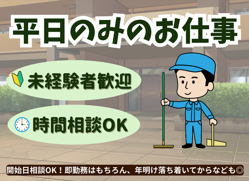 仕事内容 \ 男性活躍中のかんたん清掃 / 資格や経験、知識などは必要ナシ! 平日のみのおしごと! フルタイム又は時短勤務を選択OK *土日祝は休み *勤務日数は応相談 *若手から60歳までのスタッフが活躍中 -・-・-・-・-・-・-・-・-・-・- < お任せするのは… > アパートやマンションの 通路、エントランス、お庭などの 共有部分の清掃になります。 ※トイレ掃除はありません 難しい作業は一切ないので、 未経験からでもスグに慣れますよ。 水仕事もほぼありません。 たまにご要望をいただきモップ使用での 拭き掃除があるくらいです。 ■勤務地 福岡市内及び近郊の各現場 (事務所に出勤後に向かいます) ◆即勤務OK! ◆勤務開始日相談もOK (年明け落ち着いてから…等も相談OK)