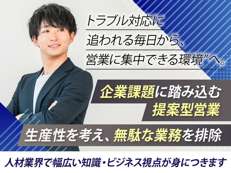求めている人材 ・営業経験3年以上 ・高卒以上 ・普通自動車運転免許 【必須】 ・主体的に行動できる方 ・課題解決型の営業提案ができる方 ・ホスピタリティをもって相手に向き合える方 【歓迎】 ・法人営業経験 ・人材業界経験 ・組織マネジメント経験 【こんな方におすすめ】 ・今の環境では年収に限界を感じている方 ・営業経験を活かしてさらに収入を伸ばしたい方 ・単価や案件の質にこだわって営業したい方 ・成果を正当に評価されたい方 ・マネジメントや営業所運営にも挑戦したい方 ・営業として経営視点を身につけたい方 ・同じ労力でより高い成果を出したい方 ・将来的に所長、エリアマネージャーを目指したい方
