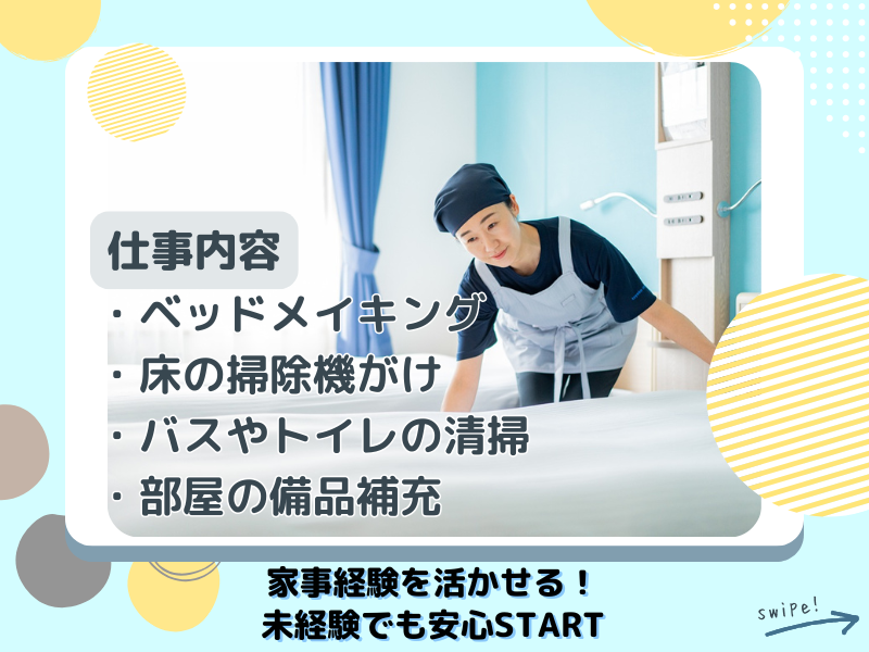 仕事内容 \家事や育児とムリなく両立!/  ̄ ̄ ̄ ̄ ̄ ̄ ̄ ̄ ̄ ̄ ̄ ̄ ̄ ̄ ̄ 朝の時間は家族を送り出し、 夕方は家事やお迎えもこなせる 絶妙な勤務時間が魅力です。 【具体的には】 ■アルコール消毒 ■ベッドメイキング ■床の掃除機がけ ■バスやトイレの清掃 ■部屋の備品補充 など その他に付随するお仕事。 マニュアルや研修があるので、未経験の方でも安心です。 接客はなく、1人でコツコツと作業します! 体力に自信あり!や 仕事を終えた後の達成感がたまらない! といった方にはピッタリです! ✨子育て中でもOKの勤務時間✨ - ほぼ残業はありません! 小さなお子様がいる方にも スキマバイトとしてピッタリ♪ 主に主婦の方が活躍中のため、 子育てに理解のある職場です。 子どもの突然の風邪などの 突発的な休みでも皆で協力できる体制が整っているから 安心して働けます。 勤務日はシフト制になっているので 家庭の用事や学校行事など 予定があっても希望休みが可能です! スタッフ想いの支配人のため、シフトの融通◎ 【応募方法】 ✨直接採用担当とお話ししたい方 →電話での応募大歓迎! 092-475-1045 までお気軽にお問い合わせください! ✨【応募】ボタンから応募の方 →エントリー後、担当者からご連絡差し上げます。 ご連絡が取れる 電話番号またはメールアドレスの 記載をお願いします。