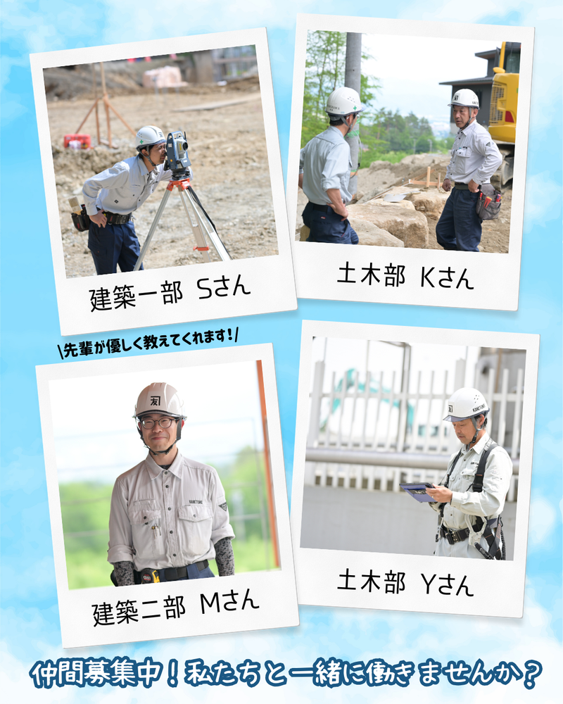 仕事内容 \ この求人のポイント♪ / ●創業70年以上の安定した経営基盤 ●40歳以下の限定採用!未経験者歓迎! ●年間休日125日、土日祝休み、 昇給・賞与など待遇充実 \ SNSを日々更新中です! / 会社の様子や日々のニュースを SNSにて発信しています。 会社の雰囲気を知ることができますので、 ぜひチェックしてください♪ https://www.instagram.com/kensetsu_kanetomo_nagano/ ―――――― 仕事内容 ―――――― 東京支店にて民間工事の新築工事(一部改修工事)を担当していただきます。 マンションや社屋、住宅、宿泊施設など、幅広い案件に携わることができます。 主な業務は以下の通りです。 ◆工程表の作成 ◆スケジュール管理 ◆現場の安全管理 ◆協力会社や職人との連携 ◆お客様への引き渡し業務 業務は先輩が必ず指示を出し、 その結果をフィードバックする 教育環境でお迎えいたします。 納得感を得ながら成長できるので、 自信をもって活躍できる人材に成長可能。 ―――――――――― キャリアについて ―――――――――― 施工管理部門でリーダーや管理職を 目指す道だけでなく、 他部署やポジションへの ジョブチェンジも ご希望があれば柔軟に対応します。 経験ではなく人柄を見て判断するため、 新しいことにチャレンジしやすいのも 当社の魅力のひとつです。 また東京支店・長野本社の異動希望も可能。 「長野で働いてみたい」 「東京にUIターンしたい」など ライフプランに合わせて柔軟に対応します。 ―――――――― 当社について ―――――――― 長野県茅野市にて1948年に創業してから70年以上、 地域に密着した総合建設会社として 広く親しまれてきた私たち。 公共工事から民間工事、大小工事のほか、 エネルギー事業、福祉事業と幅広い分野を通じて、 持続的な発展と社会貢献を続けています。 創業77年と老舗ながら 地域トップクラスの業績を誇り、 4期連続売上過去最高更新中。 今回はそんな当社のこれからを 担っていくメンバーの増員募集となります。 ―――――――――――― ワークライフバランス ―――――――――――― 年間休日125日で土日祝休みです。 月残業平均は20時間程度と短めで、 仕事とプライベートを両立できます。 ✅賞与年2回 ✅通勤手当 ✅家族手当 ✅住宅手当 ✅資格手当 など、賞与や手当も整っています。 将来的に年収900万円クラスの 高収入を獲得できる会社です。