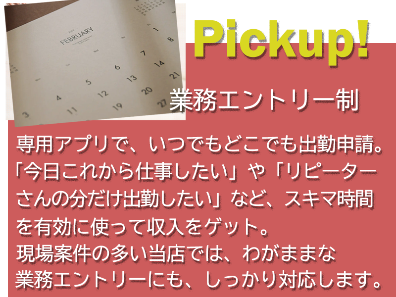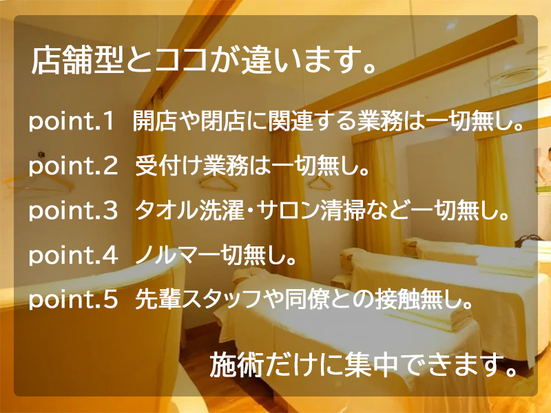 アピールポイント: 「ありがとう」の数だけ、給与明細が厚くなる。この仕事は、もっと評価されていい!! (1) なぜ、出張・訪問型マッサージの利用が増加しているのか? 新型コロナウイルスの感染拡大は、人々の生活様式や消費行動を大きく変えました。消費者が事業者に対する期待は「価格と品質」から「健康・安全・安心」にシフトしました。 そういう社会背景により、「店舗に出向かず、安心できる自宅でマッサージを受けたい」や「より深いリラックスをして睡眠につきたい」などのような購買の意思決定が変わったお客様が増えました。 [お客さんが出張型を利用するメリット] 1. わざわざお店に出向く必要がない 2. リラックスして一番安心できる空間で施術を受けれる 3. 施術後、すぐにそのまま眠れる (2) 当店の特徴 創業9年目をむかえる当店は、コロナ禍以降の時代の変化をチャンスと捉え、顧客の声を聴き、商品やサービスに落とし込みして提供します。 データやテクノロジーを駆使し敏速に軌道修正しながらサービスの質を向上させてお客様満足度を高めていきます。 また、現場で働くスタッフさんには「なぜ?」とか「どうして?」と出来る限り思わせない仕事の環境作りをしたい。そういったストレスを可能な限り与えないために、業務上のあらゆる情報をデータ化し、それら情報をシェアして、可能な限り安心して施術に集中できる環境作りに取り組んでいます。 特徴1. 創業9年目のノウハウと実績 特徴2. 完全自宅待機 特徴3. メニュー単価が高価設定 特徴4. 完全自由出勤 特徴5. 当日の急な出勤希望にも対応 特徴6. 報酬は完全日払い 特徴7. 来店不要! スマホで簡単登録~お仕事開始 特徴8. Wワーク歓迎! 特徴9. 顧客の利用・施術履歴をオンラインで確認 特徴10. お仕事体験会。実際にお仕事した後に入店を決めれます。 (3) お仕事する環境 ●ご利用されるお客さん層は 男性単独 55% 女性単独 15% ご夫婦またはカップル 30% ●出勤は業務エントリー制(希望する日に出勤)。 ●報酬は当日に日払い致します。 ●自宅待機 ●現場への移動は専用の送迎車 ●タオル備品一式、お店が準備し貸し出します。 ●業務は専用アプリでオートマチックに。情報もシェア。