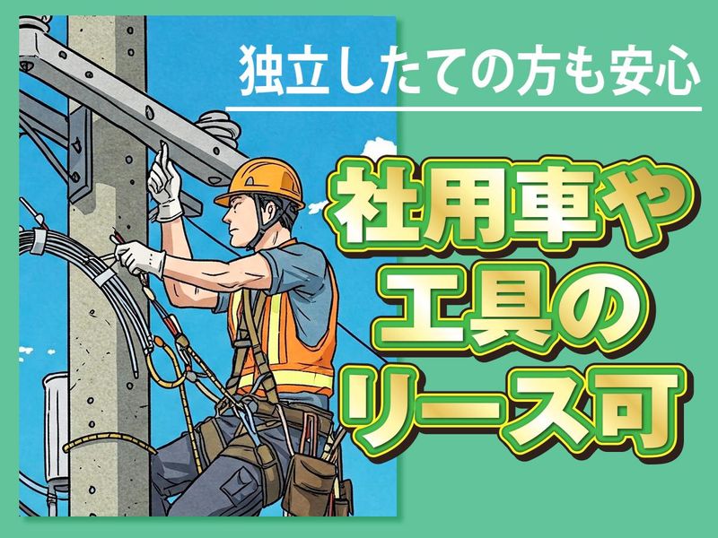 仕事内容 ✨稼ぎたい方、大歓迎!✨ 安定して仕事があるため、当社の業務を委託できる方を大募集! 経験豊富な方はもちろん、「独立したばかりだからどんどん依頼を受けたい!」という方も大歓迎です。 社用車や工具の有料リースもOKですので、道具などが揃っていない方もお気軽にご相談ください。 ■■■通信作業工事スタッフの募集■■■■ 【仕事内容】 ◆光回線(FTTH)の通信作業工事 FTTHとは:Fiber To The Homeの略で、通信回線を屋内へ引き込むこと。 簡単に説明すると、有線を家まで引っ張って安定してインターネットを使える環境を整える作業です。 <具体的な仕事の流れ> [1]FTTHご契約者様宅(一軒家やマンション)へ伺います。 [2]機械を部屋のどこに設置するかを決める [3]電柱に登り、有線を室内に引き込む [4]ネット回線を繋いだら作業完了! 【具体的な仕事内容】 ✅屋外作業…電柱から電柱、電柱からお客様宅への配線作業 ✅屋内作業…電柱からお客様宅の室内まで配線接続や設置(高所作業) 電柱にLANケーブルの配線を設置し、オフィスや住宅へのインターネット等の通信環境を新設していきます。 ■現場は調布市、府中市、世田谷区、練馬区、渋谷区、新宿区などに多数あり!東京都内で多岐に渡ります。 ■取引先は誰もが知っている大手メイン ■社用車(軽自動車)や工具の有料リースも可能 ■現場への直行直帰も可能 ■1日の担当件数を終えたら終了! 他、手書きでの作業内容の報告書作成あり。 安全第一で作業することに注力して欲しいため、別途必要な書類作成などの細かい事務作業は弊社の事務スタッフさんが担当します。 その日の作業内容をまとめる報告書のみ提出をお願いいたします!手書きでOKなのでPCスキルは必要ありません。 <経験を存分に活かせるように…> 経験があるから…、業務委託だから…といきなり放任することはありません。 仕事の流れなどもしっかり教えますし、困った時はフォローしますのでご安心ください。 社用車や工具の有料リースもOK! 独立したてで工具がない方もはじめやすい環境です。 ――――――――――――――― \安定性バツグン!取引先は大手が中心/ インターネットがある限りなくならない通信作業工事のお仕事だから、安定性は抜群! 取引先は大手が中心ですので仕事量も安定しています。